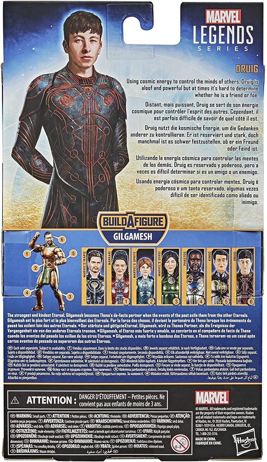 Druig es uno de los poderosos Eternos que aparecen en la película "Eternals" de Marvel Studios. Por supuesto, Druig apareció primero en los cómics, pero esta figura en concreto está basada en el aspecto del personaje en la película de 2021 dirigida por Chloe Zao. Interpretado por el actor Barry Keoghan, Druig es un eterno que se asentó en suramérica y trató de controlar con sus poderes mentales la naturaleza guerrera de los seres humanos. En esta figura perteneciente a la colección Marvel Legends de Hasbro, Druig mide unos 15 cms y viene acompañado de dos manos intercambiables y de la cabeza de Gilgamesh. Gracias al extra Build A Figure, si coleccionas todas las figuras, podrás ensamblar a tu propio Gilgamesh con las piezas que vienen con el resto de sus compañeros. Protege a la humanidad con el poderoso Druig.