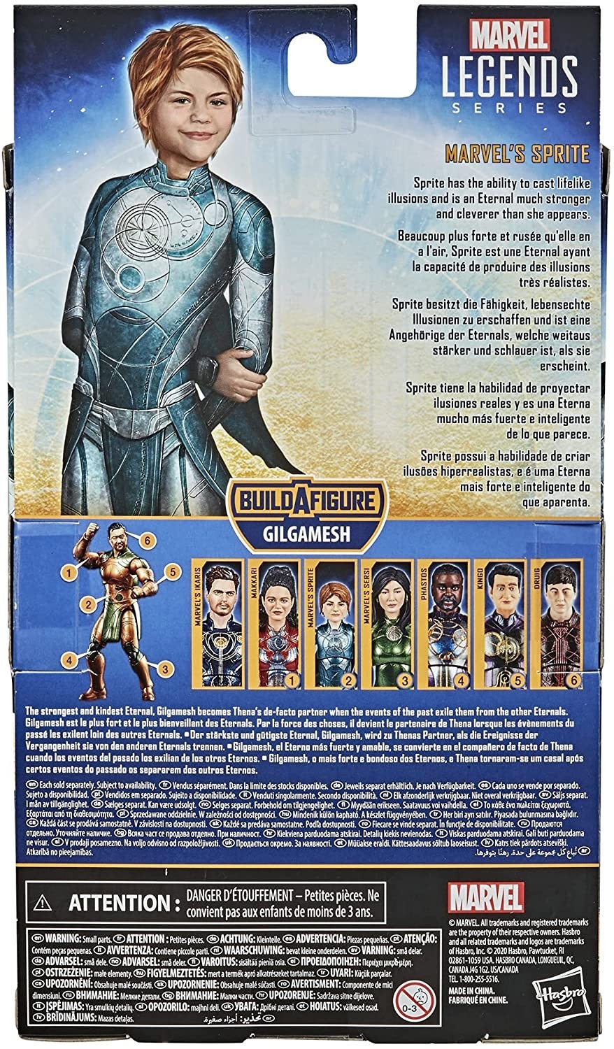 Sprite es un miembro complejo de los eternos. En los cómics era un chico, pero en la película de 2021 "Eternals" de Marvel Studios el personaje es femenino y está interpretado por la actriz Lia McHugh. A Sprite le cuesta aceptar que no va a envejecer jamás y que va a estar siempre tratada por la humanidad como si fuera una niña de entre once y trece años. La figura de acción de la versión fílmica de Sprite mide unos 15 cms y está hecha de PVC. Incluye el torso del eterno Gilgamesh, al que podrás ensamblar si juntas todas las piezas de la colección Build A Figure. También incluye dos manos intercambiables. La línea Marvel Legends de Hasbro crece con Sprite, haz crecer también tu colección con ella.