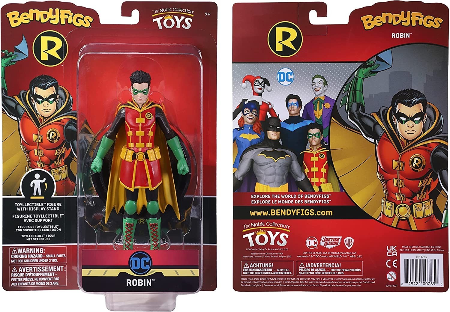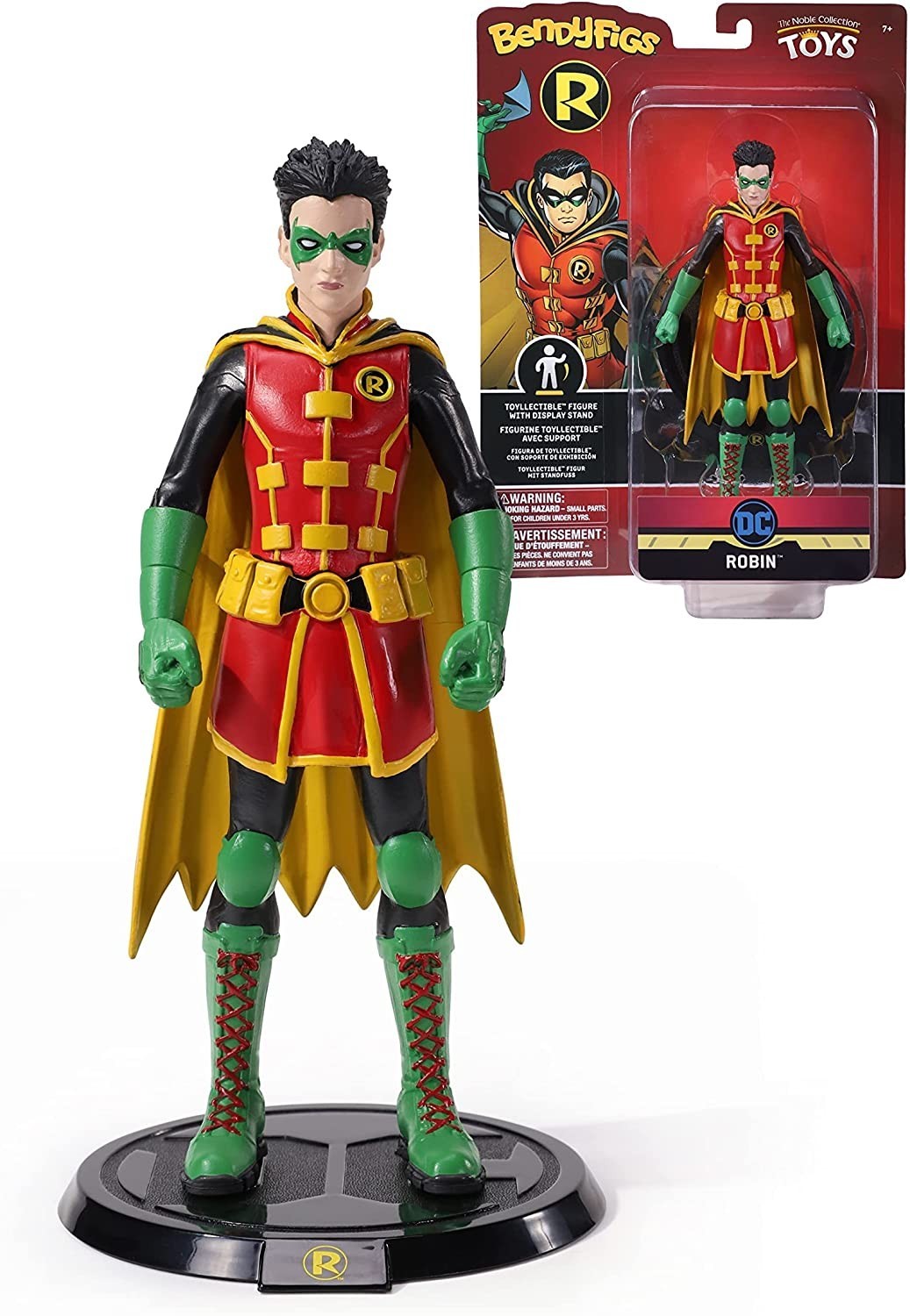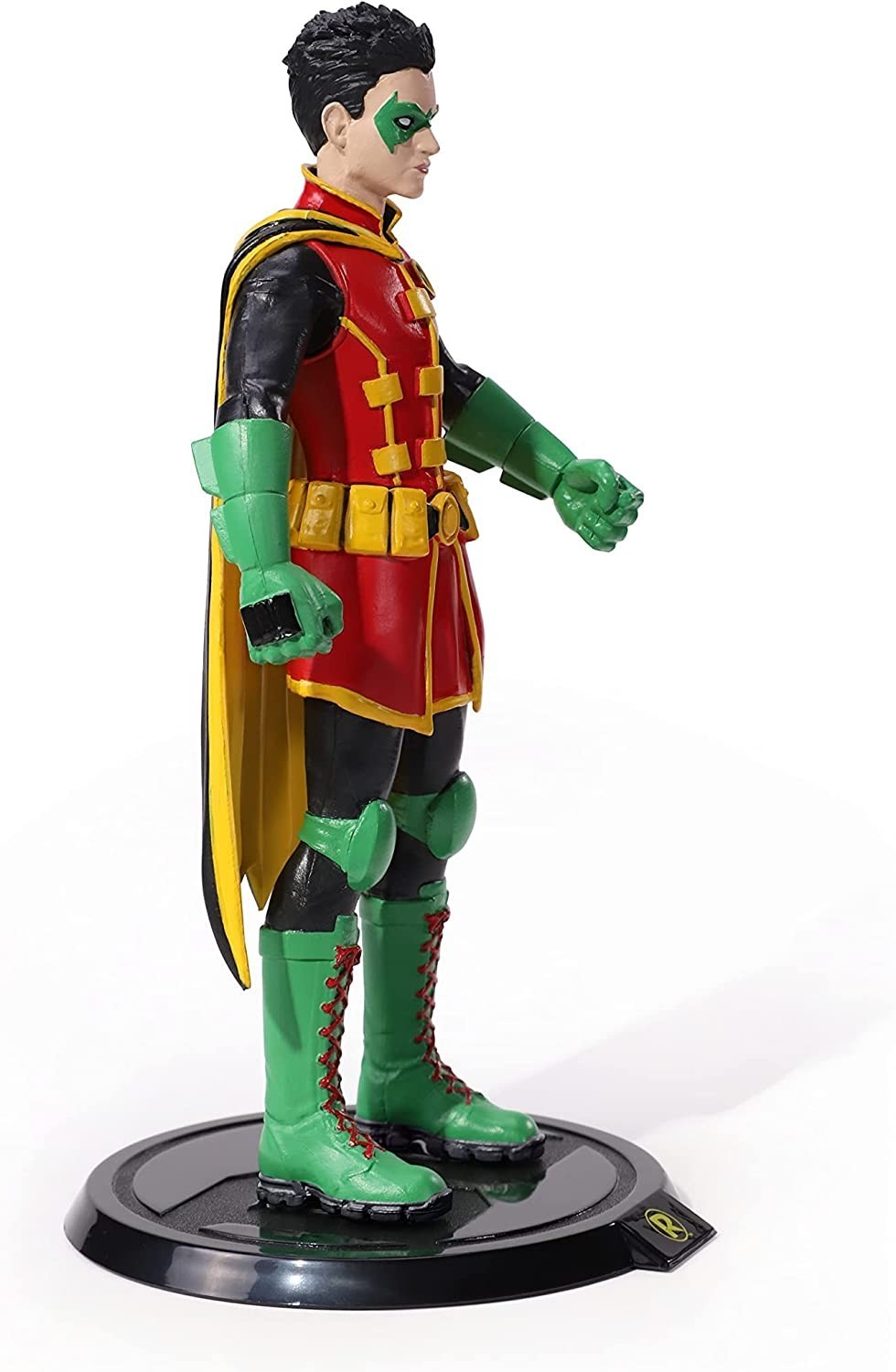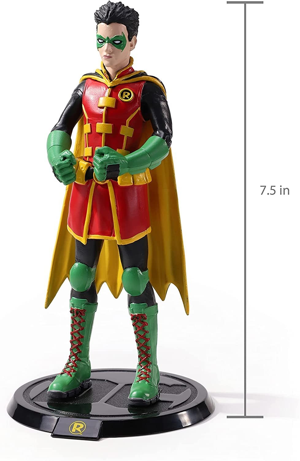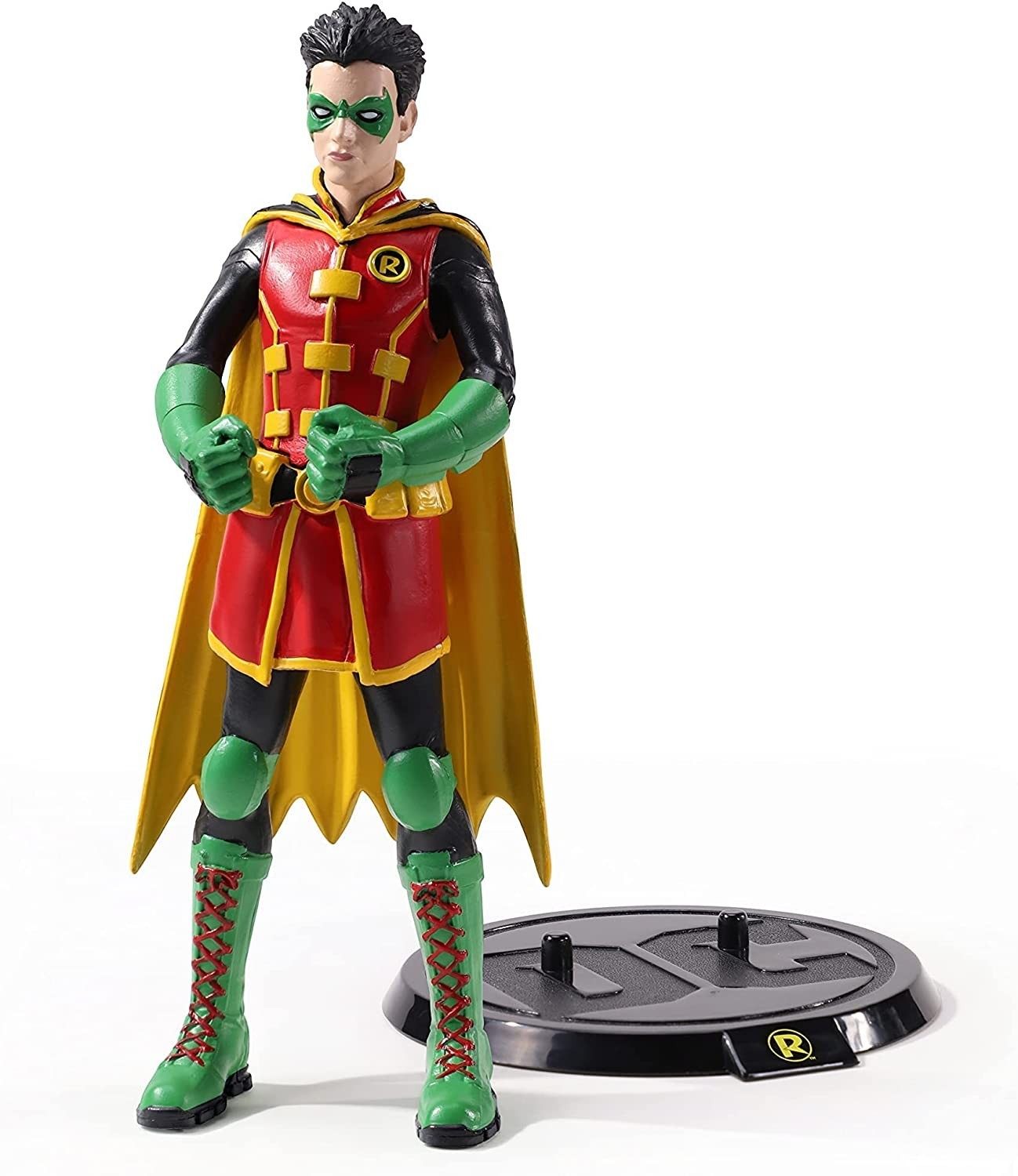 The Noble Collection nos presenta la figura flexible de 19 cms de Robin que forma parte de la colección Bendyfigs. El compañero y asistente de Batman en su lucha contra el crimen viene con una base para su exposición con el símbolo del personaje y el de la casa editorial DC. Robin está pintado de forma impecable con los llamativos colores característicos del personaje. Está hecha de PVC de gran calidad.