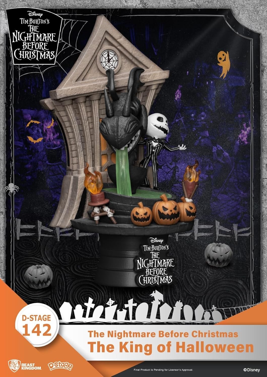 The King of Halloween es el nombre de esta figura diorama que Beast Kingdom y su línea D Stage han creado para todos los fans de “Pesadilla Antes de Navidad”. Este precioso diorama mide unos 16 cms y viene sobre una peana de exposición con el nombre de la película producida por Tim Burton y Disney. El mundo de Jack Skellington está contorsionado y tiene un diseño especialmente ‘cartoon’ en esta estatua diorama que respira Halloween y amor a la película por todos sus costados.