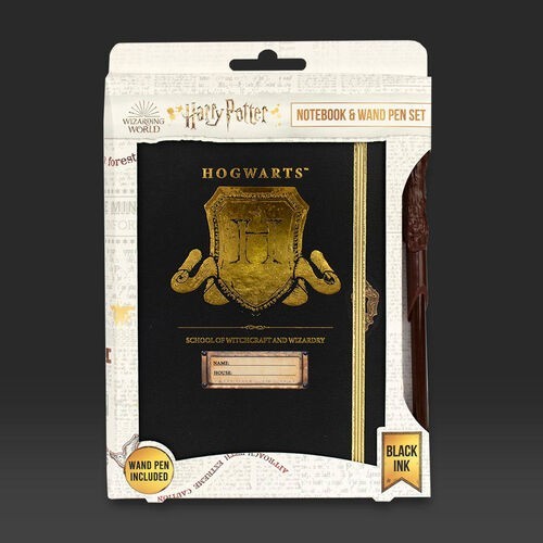 ¡Vive la magia de Hogwarts como si estuvieras en sus aulas! Blue Sky nos trae un fantástico set de cuaderno y bolígrafo llegados directamente desde el Wizarding World, el universo mágico creado por J.K. Rowling. El bolígrafo de tinta negra está camuflado como si fuera la varita mágica de Harry, y el cuaderno tiene portada negra con el símbolo heráldico de Hogwarts. Podrás poner tu nombre y casa en el recuadro destinado a ello, y hasta tiene goma elástica dorada para que no se abra y se te caigan los apuntes de pociones o los nuevos hechizos.