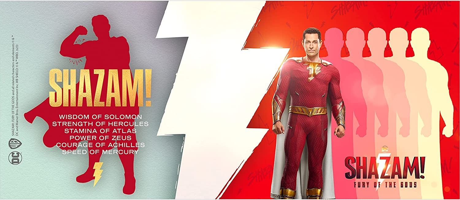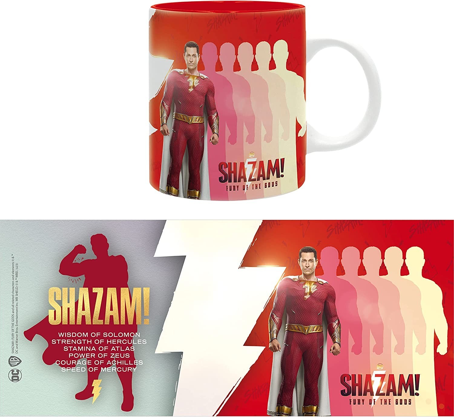 Big + Superman. Así es como se conoció a la película del superhéroe Shazam! en los circuitos de cine antes de que se estrenara. En el año 2023 se estrenó la segunda parte “Shazam!: Fury of the Gods”. Interpretado por Zachary Levy, el superhéroe Shazam! es uno de los más divertidos del universo DC. Ahora podrás desayunar cada mañana con la taza oficial de la película que ha creado la marca Abystyle. Está hecha de cerámica, tiene una capacidad de 320 mls y viene en una caja con imágenes del personaje. Además ,sobre la superficie de la taza vienen ilustraciones a todo color de la silueta de Shazam! con su nombre en color rojo. Es apta para usar en lavavajillas y microondas.