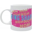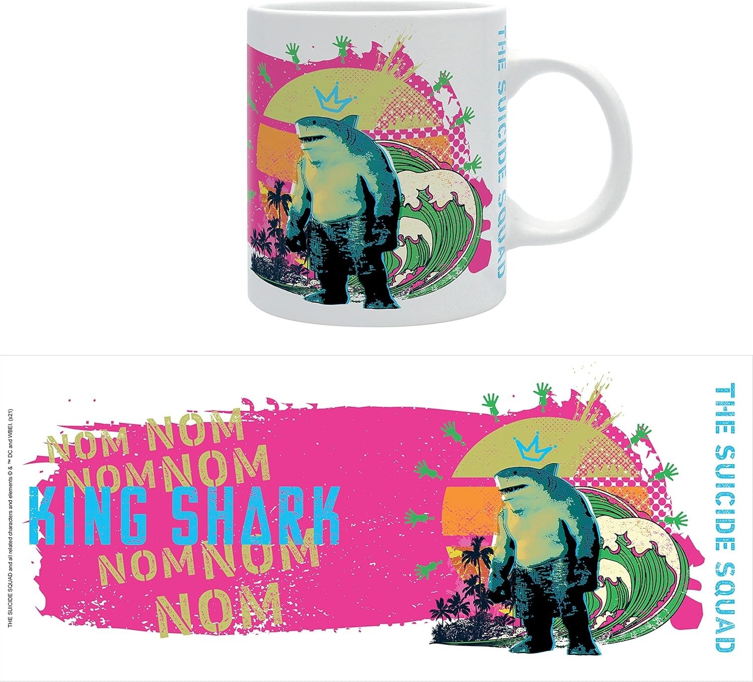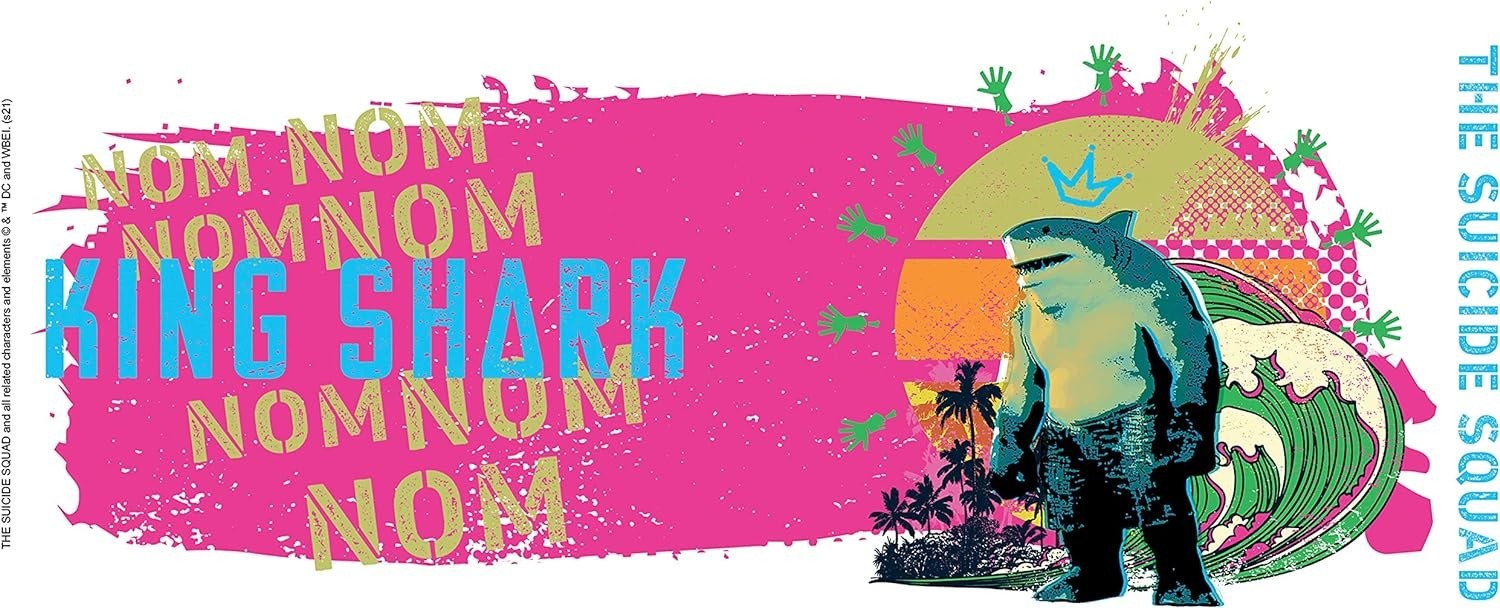 ¿Nom Nom? Estas palabras que repetía King Shark en “El Escuadrón Suicida” para expresar que tenía hambre o que algo estaba buenísimo, decoran la superficie de esta taza. En el otro lado tiene una colorida ilustración de King Shark inspirada en el surf. Está hecha de cerámica y tiene una capacidad de 320 mls. Es una creación de Abystyle y tiene licencia oficial Warner Bros y DC. Es apta para usar en lavavajillas y microondas.