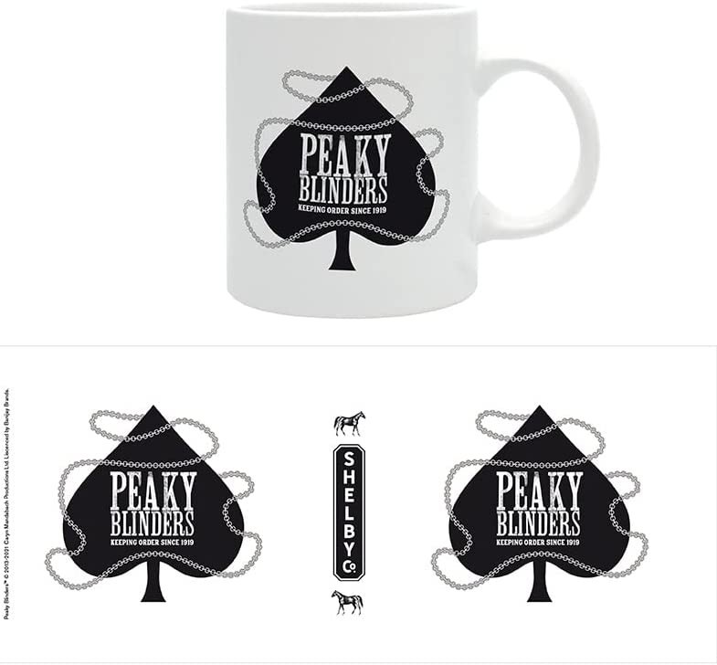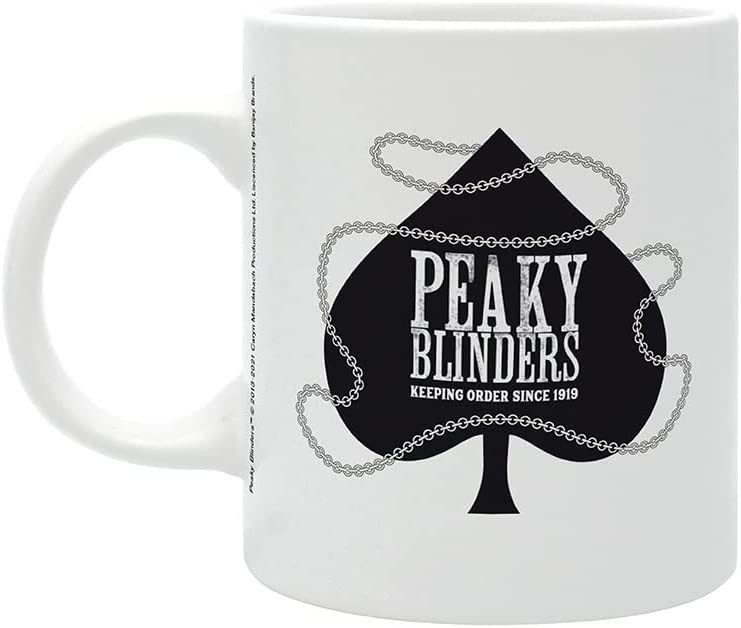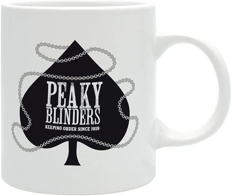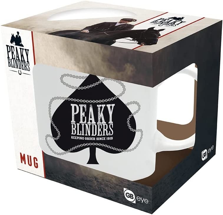La marca GB Eye se ha atrevido a pedirle permiso al mismísimo Tommy Shelby para hacer una taza de su familia… los Peaky Blinders. Esta pieza de cerámica inspirada en la serie (serión) creada por Steven Knight tiene una capacidad aproximada de 320 mls. Viene en una caja temática de la serie como buen producto de licencia oficial que es, nada de contrabando que haya pasado por las manos de Alfie Solomons o Darby Sabini. Tiene un diseño con una pica negra de la baraja con una cadena alrededor. Dentro del símbolo está el nombre de la serie con la tipografía que ves al principio de cada episodio y justo debajo la frase 'manteniendo el orden desde 1919'. Únete a la familia Shelby y desayuna como un miembro de la realeza callejera de Birmingham.
