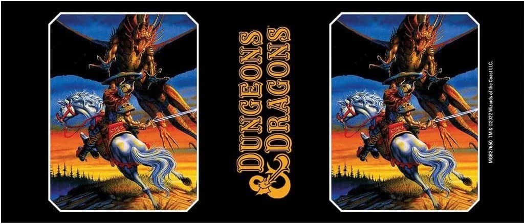 Siente el rugido de los dragones de D&D. La fantástica saga de juegos de rol Dungeons & Dragons, creada por Wizards of the Coast, ha batido todos los récords de jugadores desde hace décadas. Y no sólo eso, sino que ha trascendido la cultura popular y su esencia se ha ido traspasando de saga a saga y de franquicia a franquicia. Pyramid International te da la oportunidad de coger cada mañana energías con tus brebajes usando la exclusiva taza de licencia oficial que han creado. Tiene 320 mls de capacidad y está hecha de cerámica de gran calidad. Tiene una espectacular ilustración a todo color de un poderoso cazador de dragones a lomos de su bravo corcel blanco enfrentándose a un imponente dragón en pleno vuelo. Es apta para usar en lavavajillas y microondas.