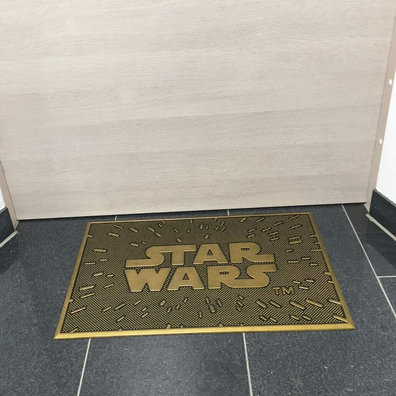Que la Fuerza y los zapatos limpios acompañen a los invitados a tu casa con este felpudo hecho de caucho de la marca Pyramid. Con unas medidas de 40 x 60 cms y una llamativa pintura dorada, esta alfombrilla convertirá tu puerta en la envidia de tus vecinos, sean Sith o no. Al estar hecho de caucho resiste mejor la humedad y hace que sea más fácil de limpiar.