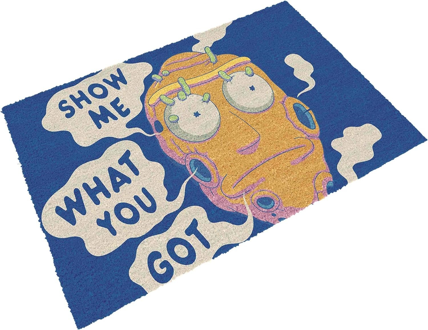 “Show me what you got”. Esta mítica frase de la serie de animación “Rick & Morty”, junto a su peculiar autor, uno de esos… entes/soles que acechaban los cielos de uno de los planetas que visitaban, sarán ahora la bienvenida a tus inesperadas visitas. Este felpudo de SD Toys con licencia oficial Adult Swim, es una representación a todo color de esa divertida escena. Está hecho de fibra de coco y PVC antideslizante y mide unos 60 x 40 cms.