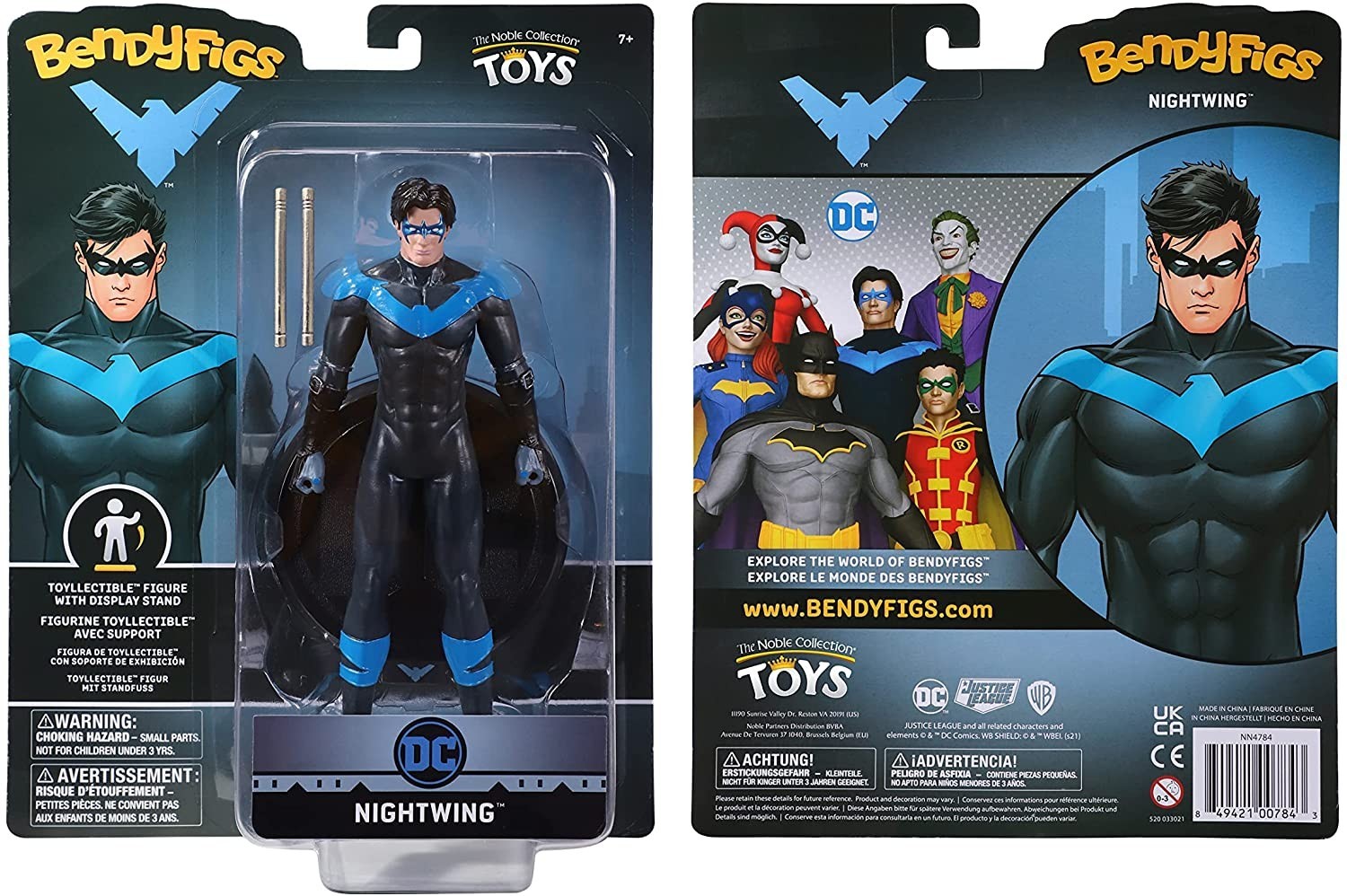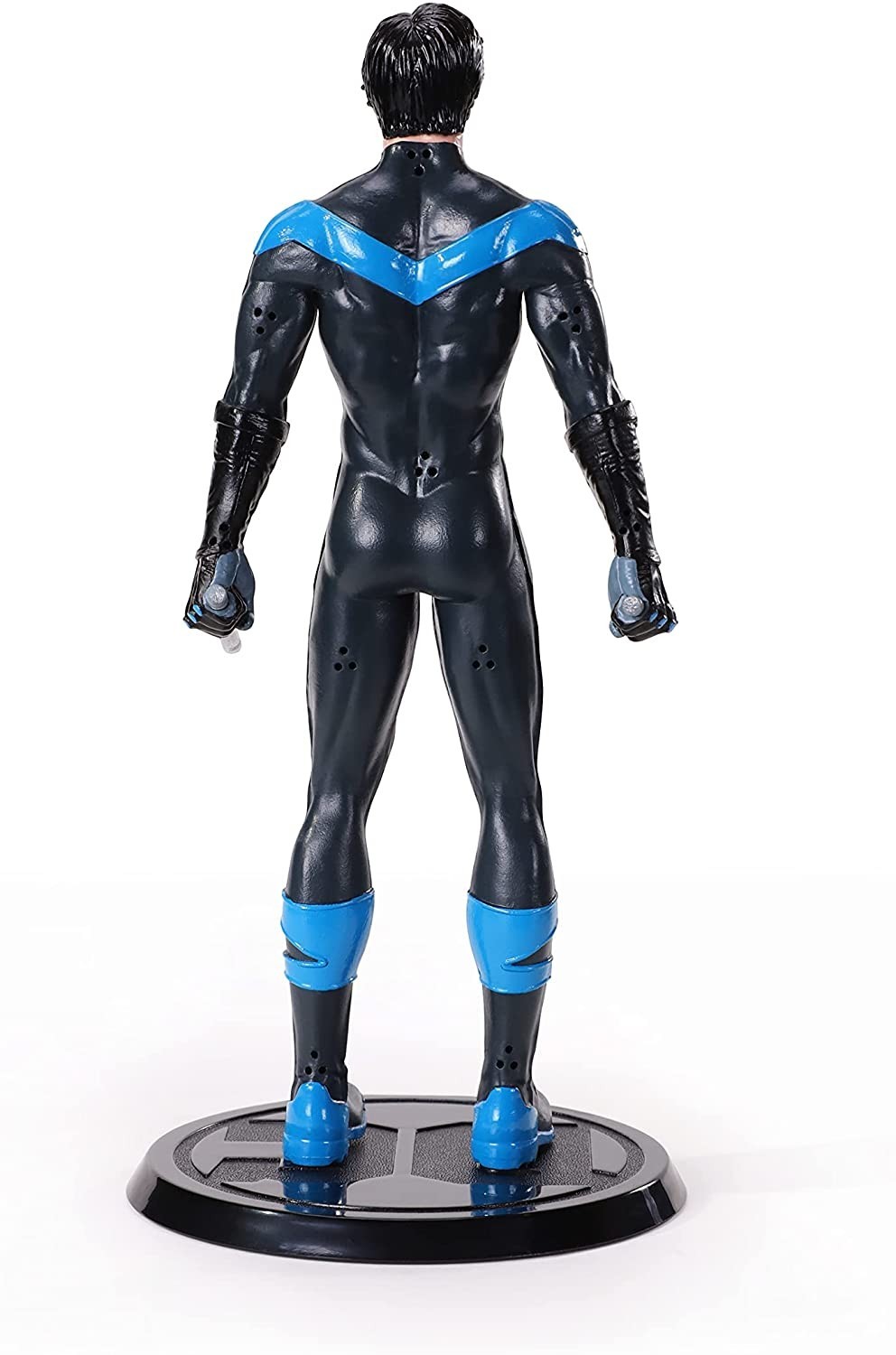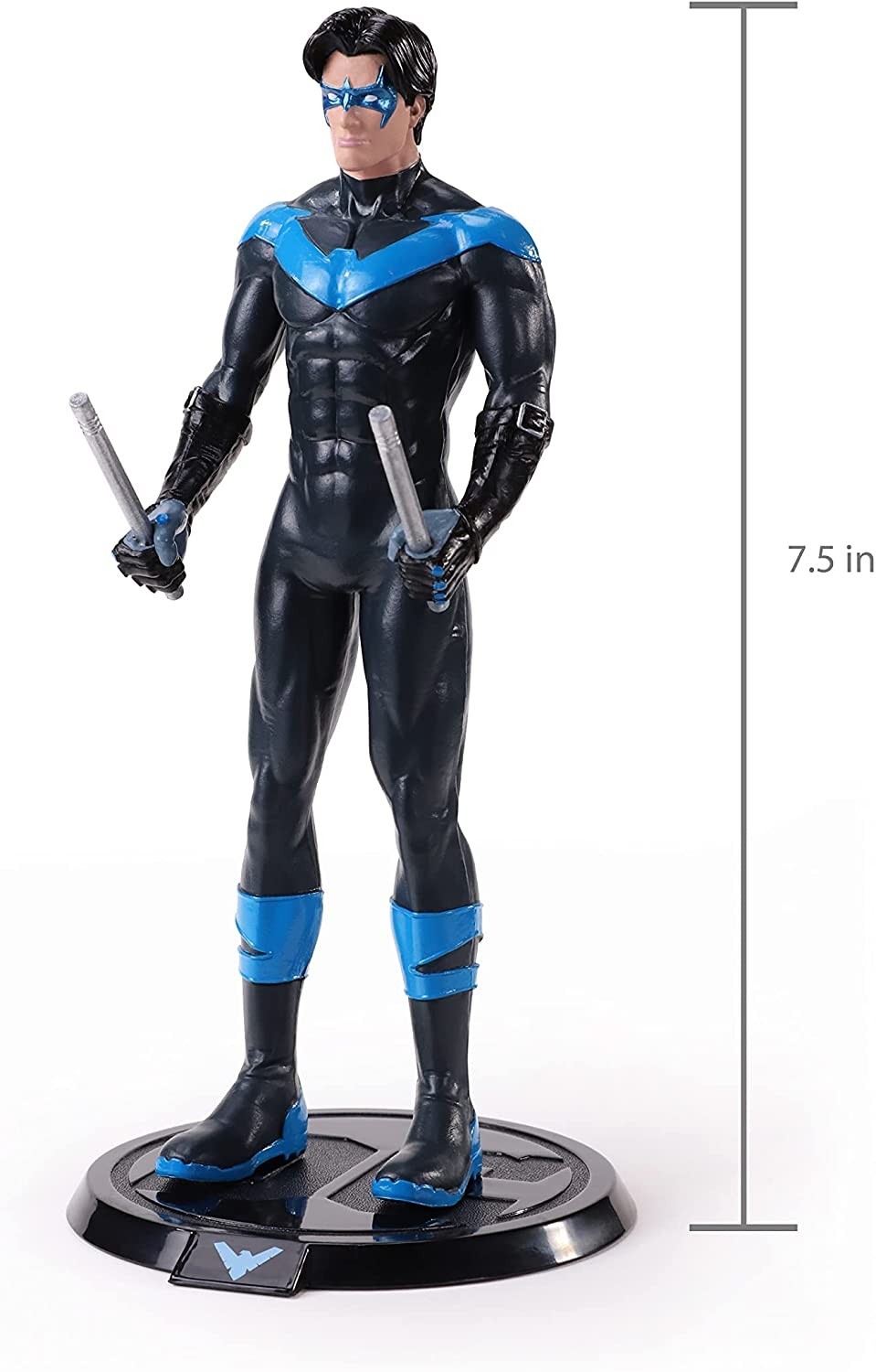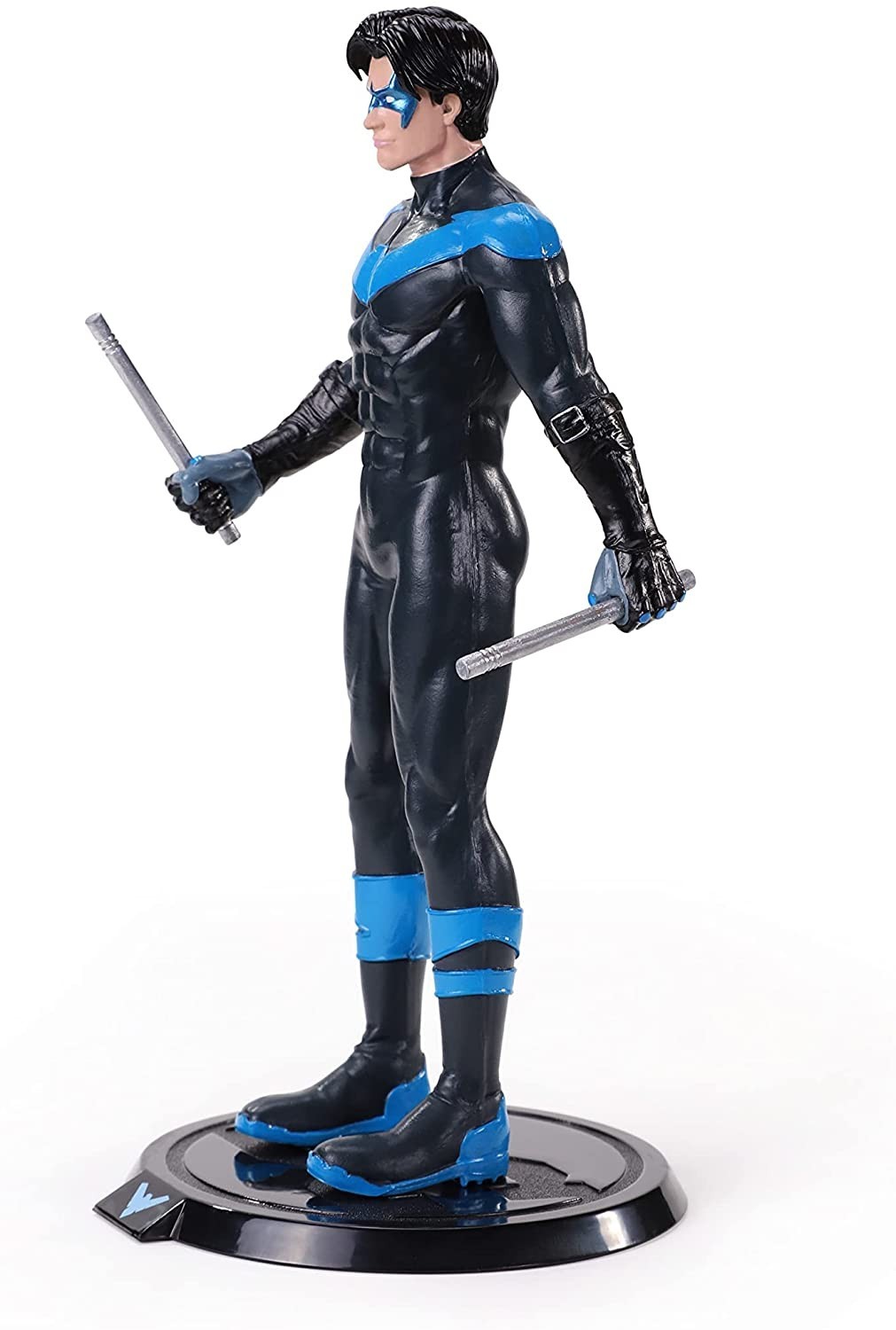 Nightwing o Ala Nocturna es la identidad que adopta Dick Grayson una vez es despedido de su rol como Robin, el compañero de aventuras de Batman. The Noble Collection te trae dentro de su línea de figuras flexibles Bendyfigs a este personaje de la galería de Batman. Está hecho de PVC, incluye una base para exposición con el logo de DC y mide 19 cms de alto. Nightwing está pintado con sus colores negro y azul característicos y tiene sus dos bastones que usa como arma y herramienta para impartir justicia en las calles de Gotham.