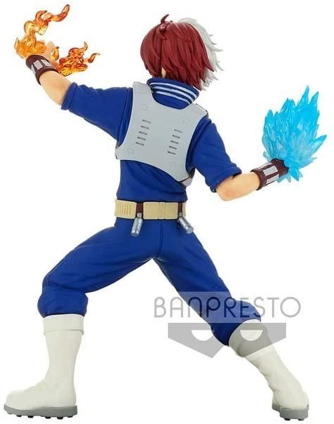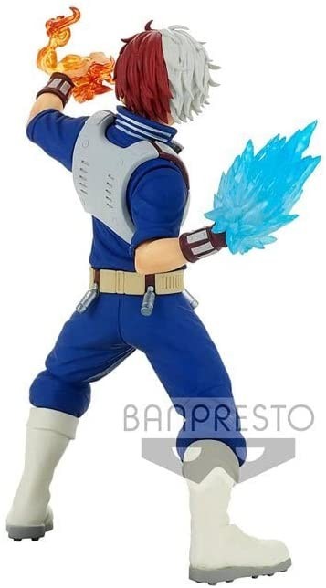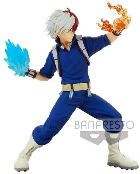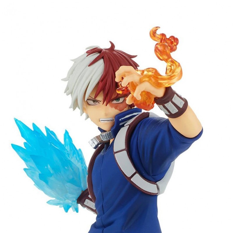Una estatua de licencia oficial del manga "My Hero Academia". Te la trae la marca Banpresto de Bandai, experta en figuras decorativas de tus animes y mangas favoritos y en los personajes más icónicos. Esta figura de Shoto Todoroki es un regalazo para los fans del manga o del mundo Otaku. Shoto es el hijo más joven de Endeavor, el héroe número 1 de la serie. La estatua de 14 cms de Shoto representa al aprendiz con su uniforme de héroe azul y cinturones en los hombros. Además, está lanzando dos efectos de poder, cada uno en una mano y con efectos distintos, uno de fuego y otro de color azul. Está hecho en PVC de gran calidad y los efectos tienen un acabado translúcido.