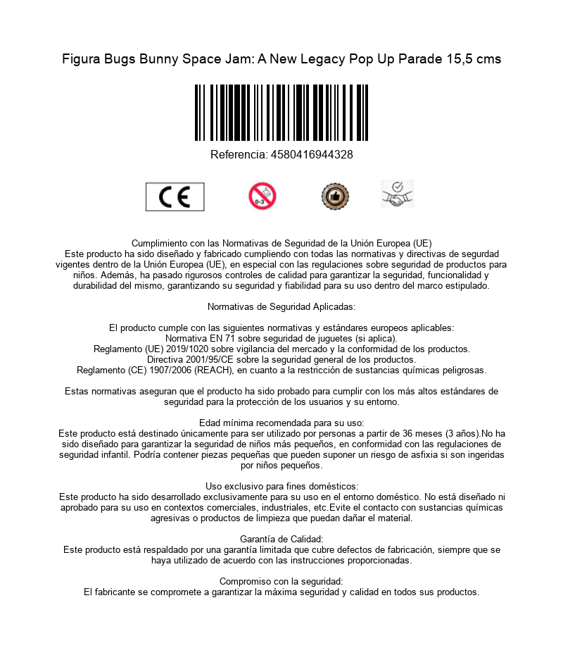 Good Smile Company ha creado una divertida figura que te causará una buena sonrisa cuando la veas. Se trata del único, el irrepetible, el icónico saltarín Bugs Bunny, líder de los Looney Tunes en una figura de la línea Pop Up Parade inspirada en la película "Space Jam: A New Legacy", secuela de la película que protagonizó Michael Jordan junto al grupo de personajes animados más querido de Warner. En esta segunda parte LeBron James recogía el testigo de Michael y se embarcaba en una aventura deportiva que repasaba varias de las sagas más famosas del estudio de cine. La figura hecha de PVC de gran calidad mide unos 15,5 cms. Incluye una peana de exposición transparente para que expongas a Bugs Bunny en pleno salto ganador.
