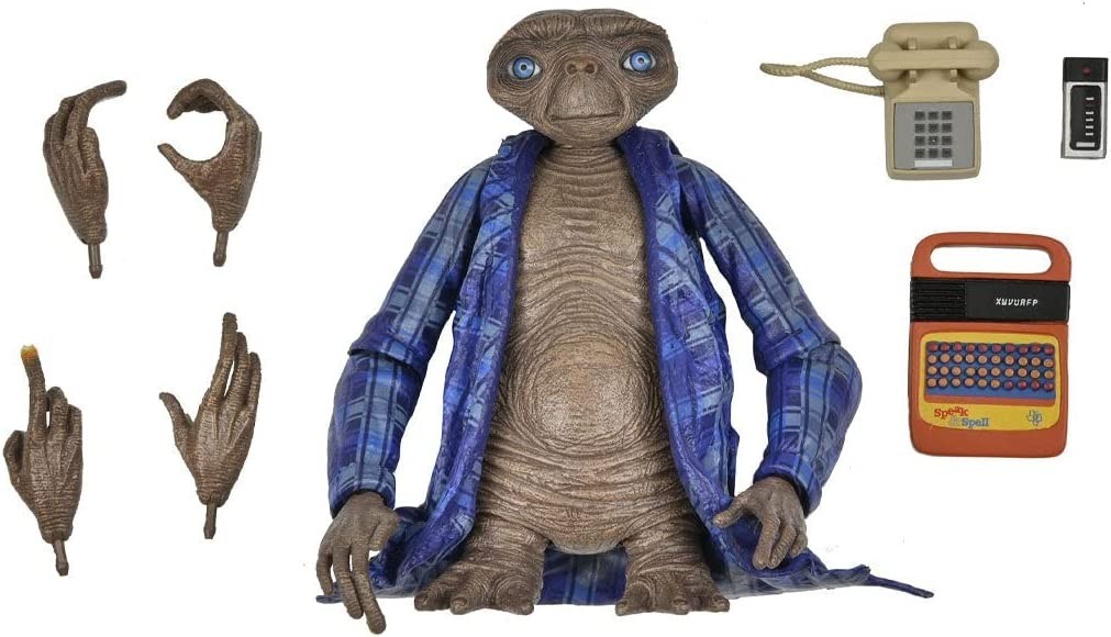 El adorable E.T. El Extraterrestre robó el corazón a los espectadores de todo el mundo en los años ochenta y su influencia sigue hoy más viva que nunca. El icónico extraterrestre salido de la imaginación de Steven Spielberg y Melissa Matheson llega a tu colección de figuras articuladas de cine con este E.T. de 12 cms. El Ultimate Telepathic E.T. representa al personaje tal y como salía en la escena en la que veía la TV en casa de Elliott, con su pizarra electrónica, dos pares de manos intercambiables (con dedo iluminado), teléfono rotatorio y mando a distancia incluidos. Lleva puesta la bata azul que lucía en este momento de la película en el que tenía la idea de construir un teléfono para llamar a su casa... Está hecho de PVC de gran calidad que ha sido pintado con extremo cuidado, desde sus arrugas hasta los expresivos ojos azules. Es una figura de licencia oficial de Amblin y Universal y viene en una espectacular caja temática coleccionable con tapa y ventana.