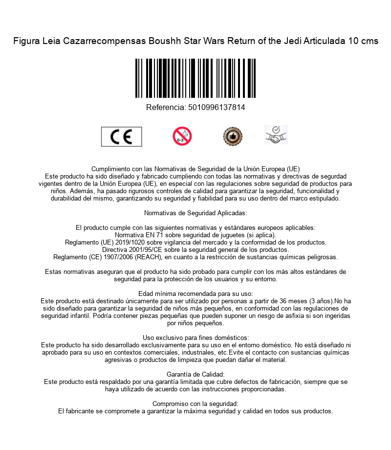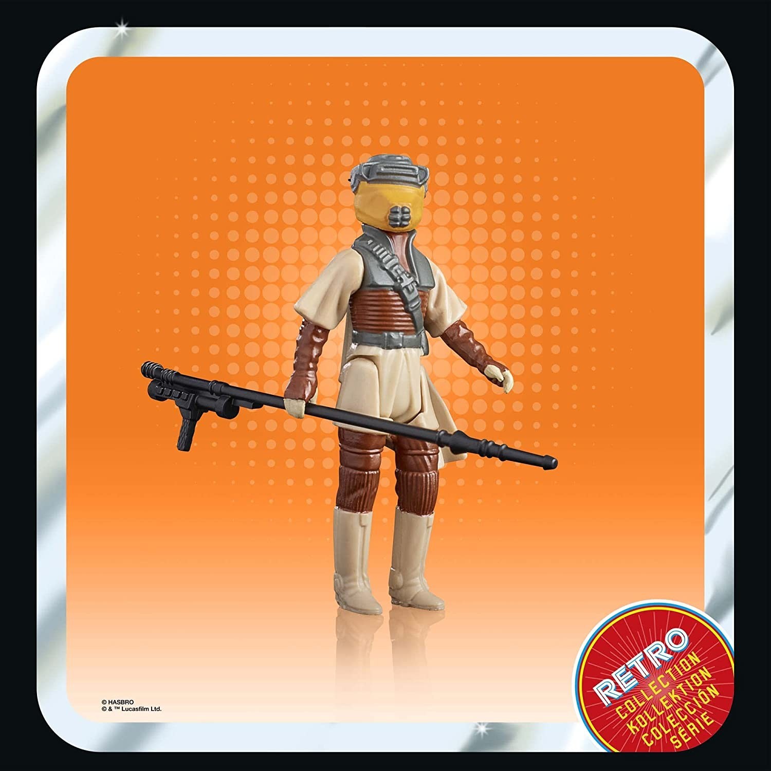 La princesa Leia Organa no esperó sentada a que Luke rescatara a Han Solo, ella y Lando tomaron la iniciativa de ir a Tatooine, al mismísimo palacio de Jabba the Hut y liberar a Han de su prisión de carbonita. Para esta peligrosa misión que acabó con Lando y ella hechos prisioneros, Leia iba disfrazada del cazarrecompensas Boushh, así no llamaría la atención en el nido de indeseables que era el palacio. La figura articulada de Leia de la traen Hasbro y Kenner, está hecha de PVC y mide 10 cms. Incluye casco y vara de lucha. Pertenece a la línea Retro que celebra el 40 aniversario de ”El Retorno del Jedi”, el clímax de la trilogía original de Star Wars creada por el visionario George Lucas.