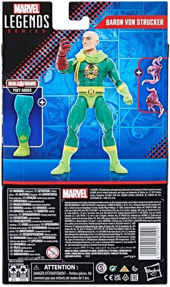 ¡Hail, HYDRA! Esa es una de las frases recurrentes del villano (no podía ser de otro modo) Baron Von Strucker. El ex oficial Nazi fue modificado para no envejecer y poder vencer a la muerte y volver una y otra vez como un boomerang con su inamovible deseo de lograr un genocidio. Este enemigo de los Vengadores puede ser parte de tu colección de villanos Marvel gracias a la figura de acción articulada que nos trae Hasbro y que pertenece a la línea Marvel Legends. Mide unos 15 cms e incluye accesorios como dos efectos de poder para sus manos y una pieza de Puff Adder para que la juntes con las del resto de la colección Build-A-Figure y ensambles a tu propio Puff.