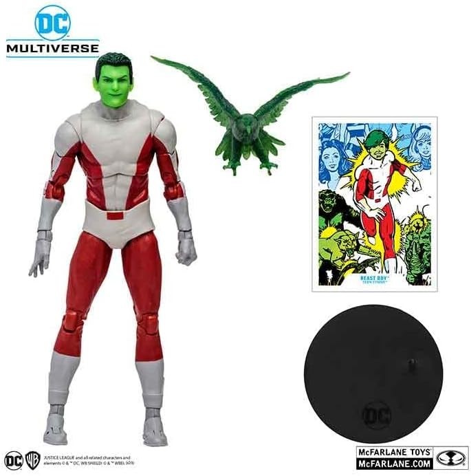 Adaptación rebelde… Estos son de los dos principales atributos de Garfield Mark Logan, más conocido como Beast Boy. Este miembro de los Teen Titans de cara verde y uniforme rojo y blanco, llega a tu casa en forma de figura articulada de 18 cms hechos de PVC de gran calidad. Pertenece a la línea DC Multiverse de McFarlane Toys y tiene el sello Gold Label, convirtiéndola en una figura imprescindible para los fans de DC y de este supergrupo formado por adolescentes metahumanos. Incluye accesorios como peana de exposición, un ave y una tarjeta coleccionable de Beast Boy. Viene en una caja con ventana de exposición y una ilustración clásica del personaje en la parte posterior. Hazte con este superhéroe que creció en África y que conoce muy bien lo que es la evolución y la capacidad de asimilación… Aprende de él y deja que Beast Boy te acompañe en tus aventuras.