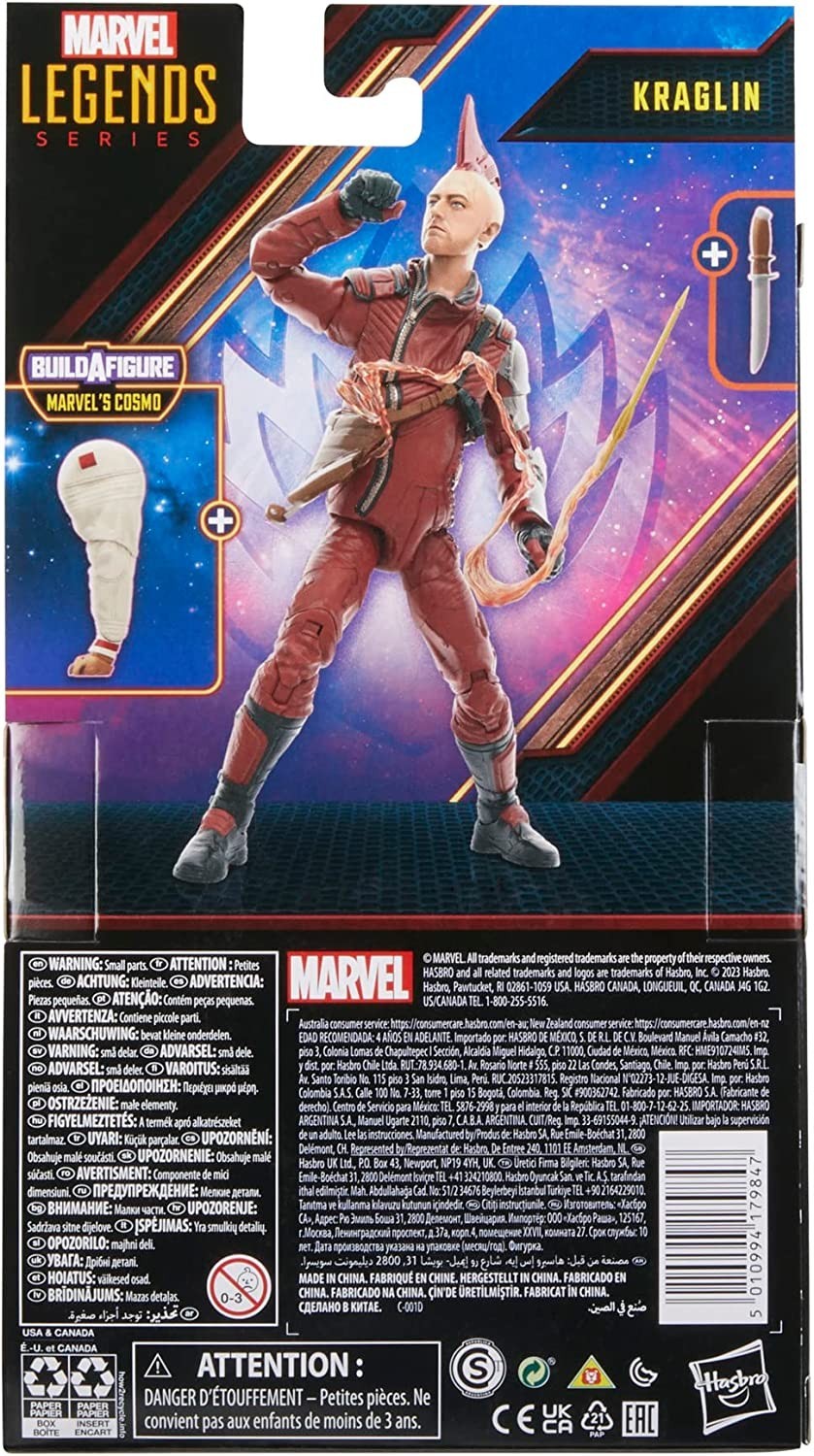 Kraglin se ganó poco a poco un hueco entre los Guardianes de la Galaxia ya desde el volumen uno. Ahora Hasbro nos trae dentro de la línea Marvel Legends la figura articulada de Kraglin basada en su aparición estelar en el volumen tres de la saga dirigida por James Gunn. Mide unos 15 cms e incluye una pieza de la perrita Cosmo para que la juntes con las demás de la colección Build-A-Figure. También viene con una navaja, parte del arsenal de Kraglin para las aventuras más peligrosas alrededor de la galaxia. Está hecho de PVC de gran calidad y viene con su aleta característica heredada de Yondu y su flecha telepáticamente controlada.