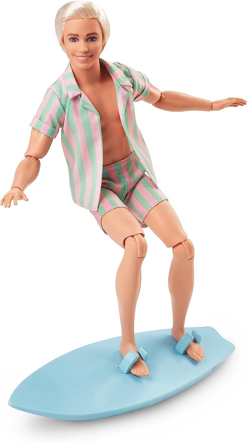 ¡Hola Ken! ¿Te preguntas a donde va? ¡Pues a la playa! Este Ken inspirado en la película “Barbie”, protagonizada por Margot Robbie y Ryan Gosling, representa al Ken de Gosling cuando va a la playa con su tabla de surf y su conjunto playero a rayas. Está articulado, mide 30 cms, e incluye su tabla de surf y su pelazo característico. Viene en una caja temática de la película y se trata de una figura de licencia oficial de Mattel, la famosísima marca detrás de estos legendarios iconos. ¿Listo para surfear?