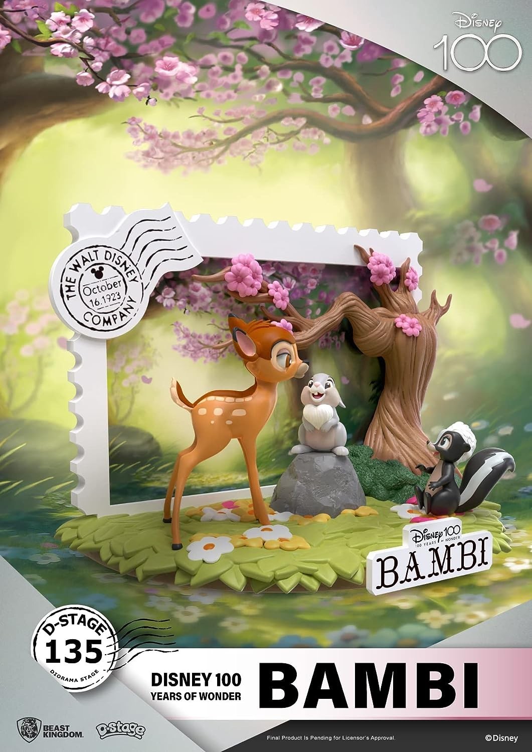 La magia del 100 aniversario del estudio Disney inundará tu estantería con este precioso diorama de 12 cms de altura de Bambi y sus amigos. La marca Beast Kingdom ha elaborado en PVC de gran calidad este colorido y adorable diorama que representa una escena de bosque de la aclamada película del estudio del ratón Mickey Mouse. Bambi, Tambor y Flor están compartiendo un momento de amistad en medio de su precioso bosque en esta pieza de licencia oficial Disney que viene dentro de una caja con efecto brillo y ventana expositora. Celebra la magia de una de las historias más entrañables de la historia de la animación con este exclusivo diorama de la línea D-Stage.