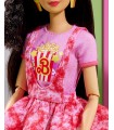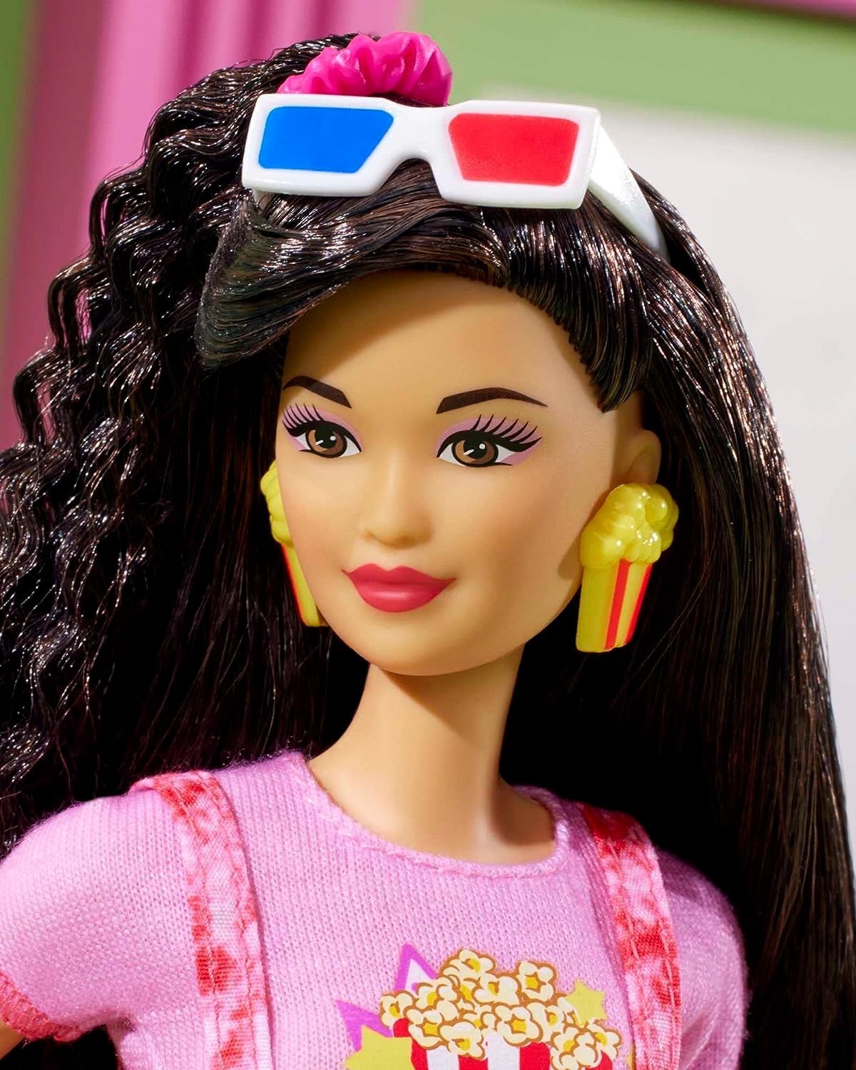 ¡Hola Barbie! La icónica Barbie ha vuelto y está viviendo una segunda juventud renovada gracias, entre otras cosas, a las nuevas líneas inspiradas en Barbies ochenteras. Una de estas líneas es la Rewind, que nos trae a la famosa muñeca en varios contextos super divertidos inspirados por la cultura popular de la década de los ochenta. Esta muñeca Barbie at the movies (en el cine) lleva un divertido ‘outfit’ con e incluye peana de exposición con forma de cinta de cassette, soporte, dos entradas de cine, bolso con forma de copa de helado, galletita pretzel, bandeja, bebida, palomitas y gafas 3D retro. Además, viene en una caja espectacular con forma de cinta de VHS gigante e incluye una funda. Esta Barbie articulada de la prestigiosa marca Mattel, creadora del fenómeno, mide 30 cms y será tu nueva compañera de pelis.