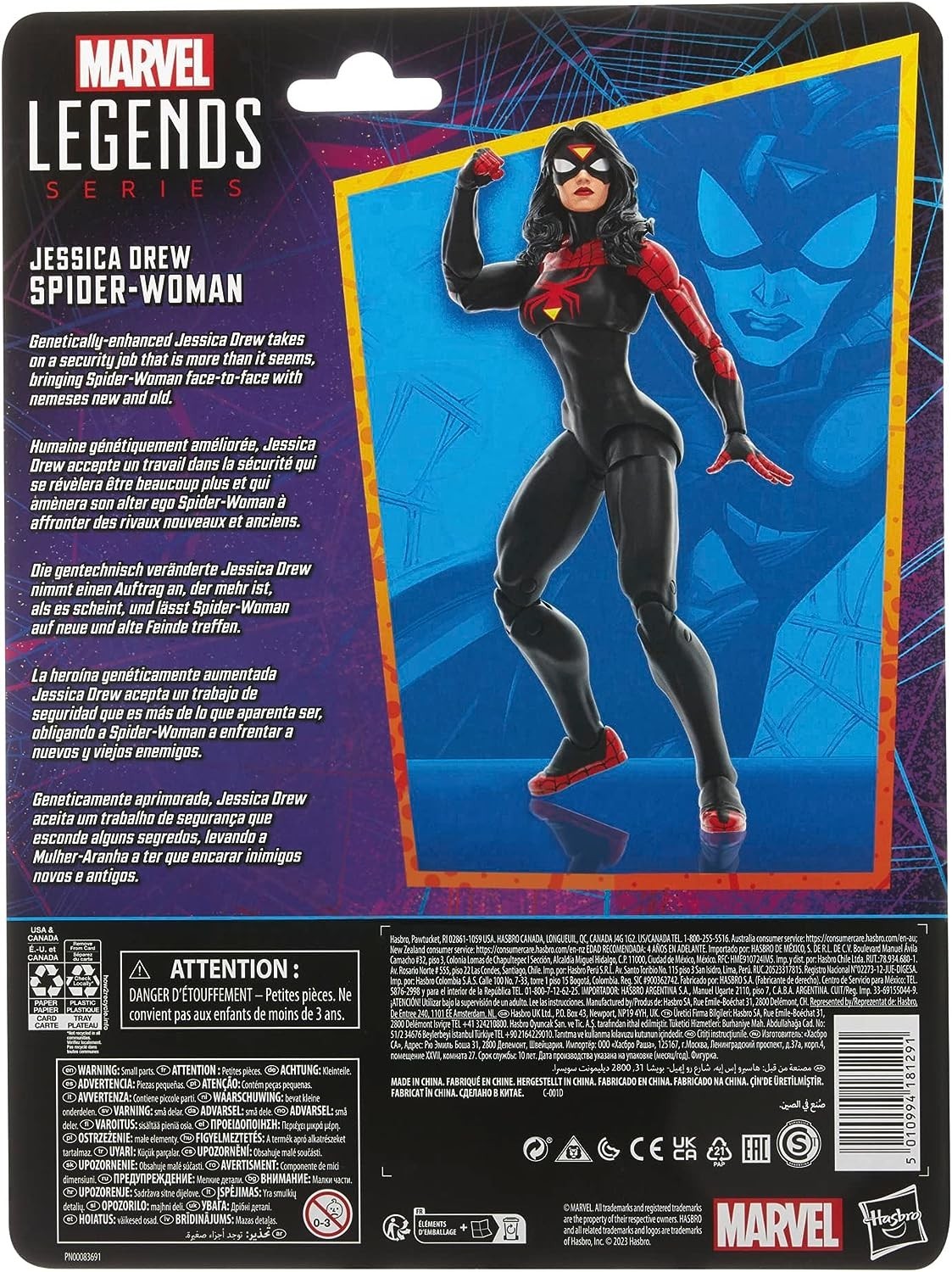 La Spider-Woman de Jessica Drew llega balanceándose desde los rascacielos de Nueva York a tu colección de figurones Marvel. Pertenece a la serie Marvel Legends de Hasbro y mide 15 cms de puro poder femenino arácnido. Lleva un traje negro y rojo y una máscara parcial que la permite tener la boca y su larga melena negra al descubierto. Está hecha de PVC de gran calidad e incluye dos manos adicionales. Viene en un espectacular y colorido blíster que parece sacado directamente de las viñetas de los cómics, al igual que la propia figura de Jessica. ¡Hazte con ella y amplía tu Spider-Family!