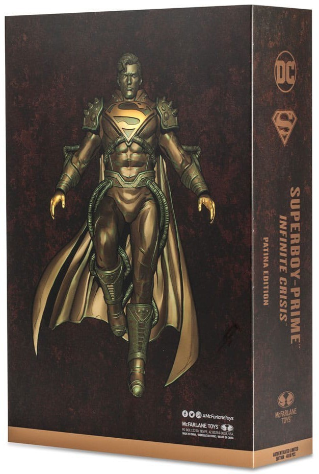 El lore de Superman es uno de los más ricos dentro del universo DC Cómics. McFarlane toys, la legendaria marca de figuras creada por el monstruo (figuradamente) Todd McFarlane, nos trae la figura articulada de Superboy-Prime. Y no una cualquiera, está basada en Infinite Crisis y es una Patina Edition, por lo que la figura tiene un acabado imitando el bronce que la hace ES-PEC-TA-CU-LAR. Incluye accesorios como una peana de exposición, una tarjeta coleccionable, un soporte para la tarjeta con el logo de DC y un certificado de autenticidad. Esta edición limitada a 4.010 unidades es una exclusiva 2023 de McFarlane que viene en una caja que también merece una estantería solo para ella. ¡Echa a volar con Superboy!