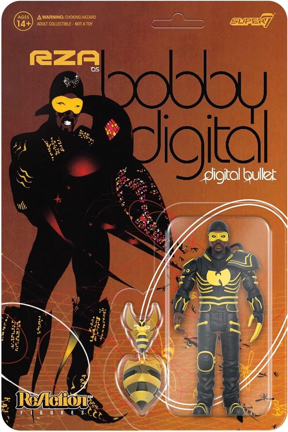 El rapero, director de cine y gran personalidad RZA ha sacado una serie de figuras junto a Super7 que rinden tributo a sus primeros discos. Disfrazado como Bobby Digital y con un blíster que es una réplica exacta de la portada del disco estrenado en 2001, la figura de RZA mide 10 cms, está hecha de PVC e incluye dos accesorios: una avispa y la parte de atrás de otra avispa, símbolos de estos primeros trabajos del artista. Pertenece a la línea Reaction Figures. ¡Que empiece el show!