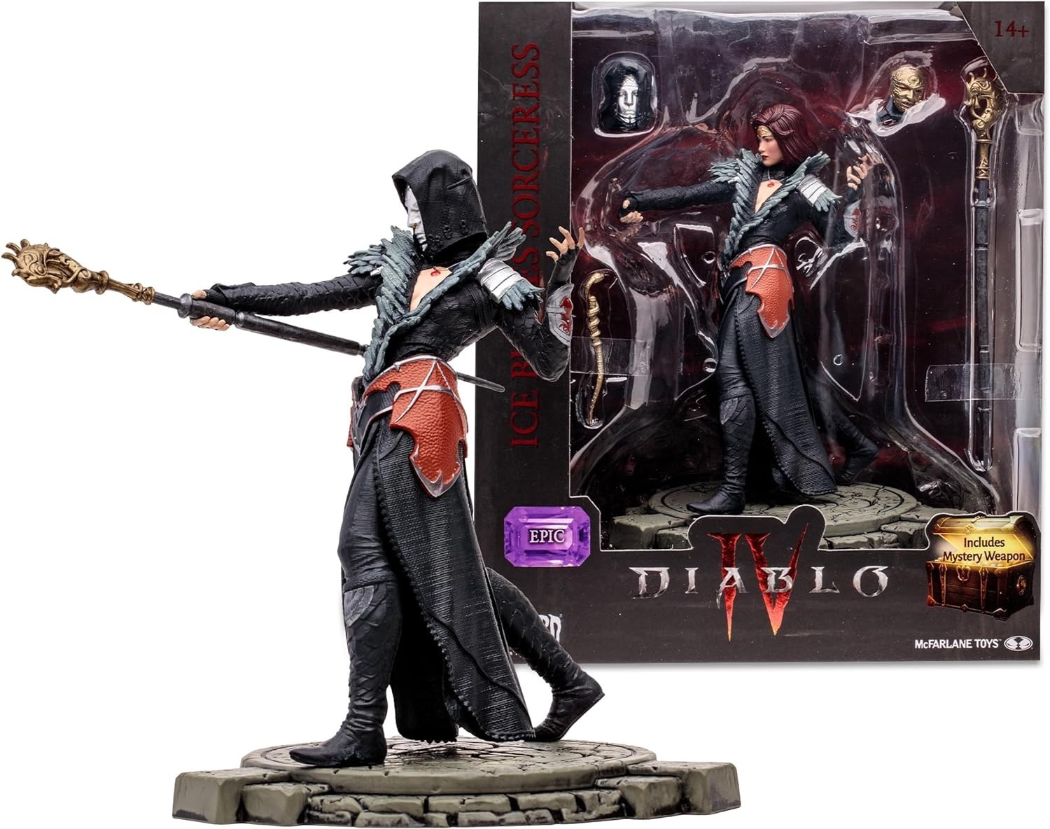 Los fans del videojuego de PC Diablo IV, están de enhorabuena. McFarlane Toys, la legendaria marca creada por Todd McFarlane, especializada en figurones de acción y de colección de las sagas más queridas de la cultura popular, nos trae una figura de 15 cms de la línea Epic de la Ice Blades Sorceress. Diablo IV cobrará vida en tus estanterías con esta colección que junta a los personajes más épicos del videojuego. Sorceress incluye un arma misteriosa y accesorios como cetro, cabeza con máscara y varita mágica. Viene sobre una peana de exposición que parece un suelo auténtico de un templo. El nivel de detalle del esculpido de esta hechicera es tan increíble que creerás que es magia Está hecha en PVC de gran calidad y viene en una caja con ventana de exposición.