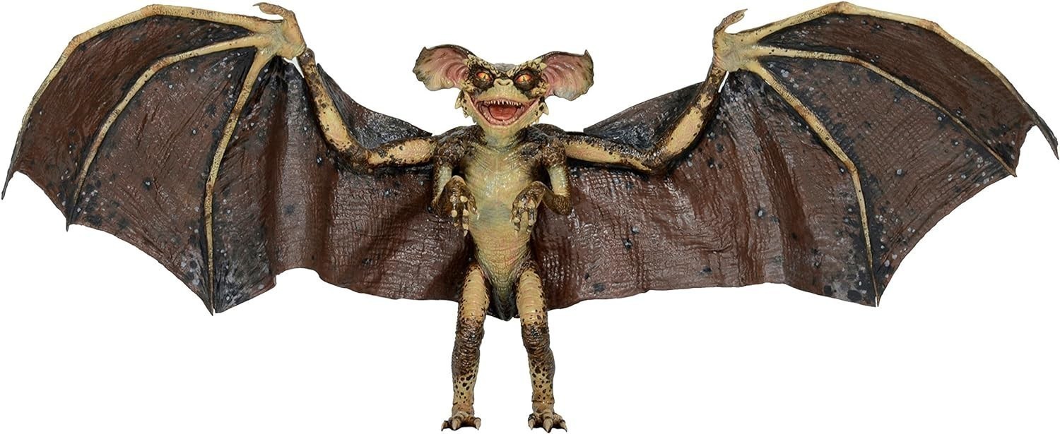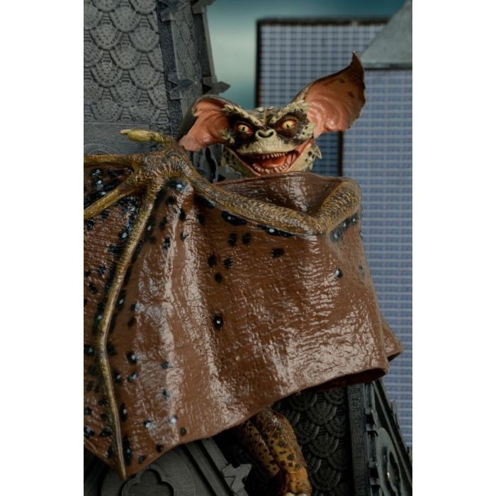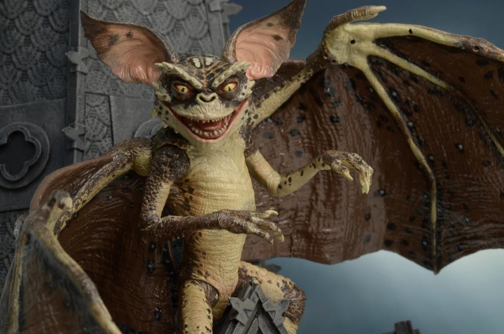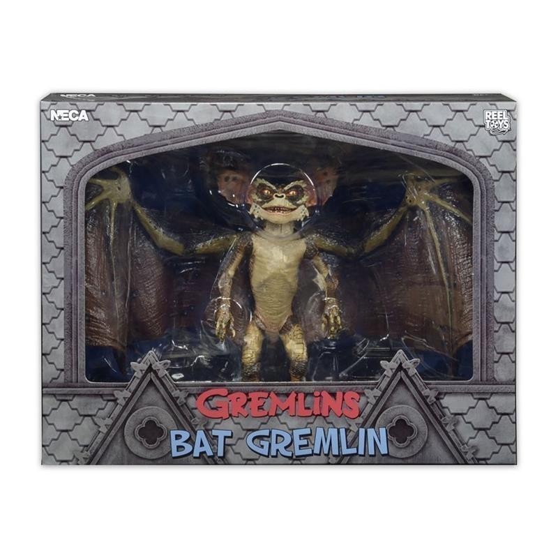 La nueva generación de Gremlins presentada en la película “Gremlins 2: The New Batch”, no solo nos presentó a nuevas y originales criaturas como este Gremlin murciélago, sino que además los llevó a un nuevo escenario en el que hacer travesuras: un rascacielos en el corazón de Nueva York. La figura Deluxe del Bat Gremlin mide unos 15 cms, está articulada, y ha sido creada por los artistas de Neca para la línea Reel Toys. Incluye una peana de exposición para poder colocar a este impresionante Gremlin en modo vuelo con sus enormes alas extendidas en todo su esplendor. Viene en una caja temática que parece la fachada de a iglesia en la que se posaba. Cada detalle de su anatomía ha sido esculpido por Jason Frailey con un cuidado exquisito.