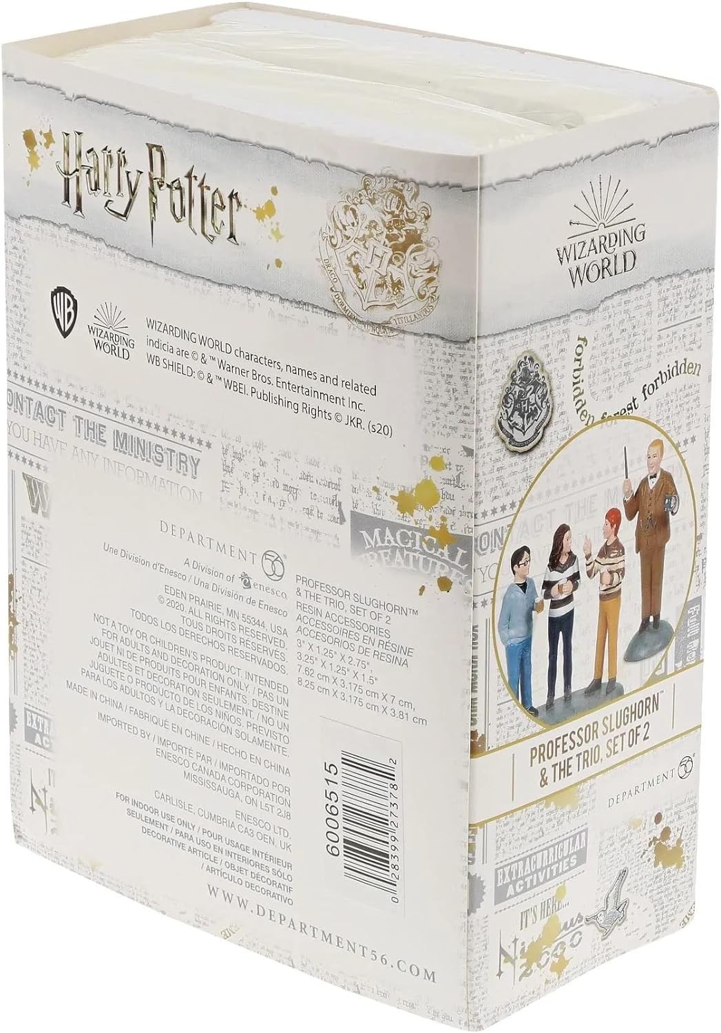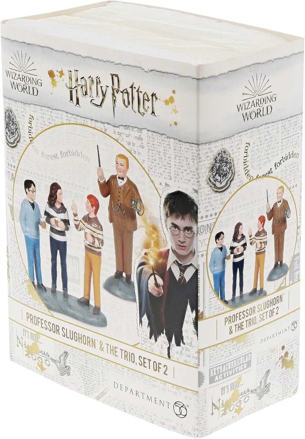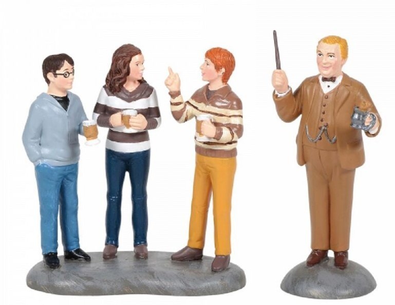 El peculiar profesor Slughorn, que ocupó el puesto de profesor de defensa contras las artes oscuras, llega a tu colección de figuras gracias a Enesco y Department 56. Los artistas de estas marcas han creado dos figuras hechas de resina y pintadas a mano que transpiran amor por Harry Potter por los cuatro costados. Una figura es la del profesor, y la otra figura está compuesta por los tres amigos protagonistas que vienen en la misma peana: Harry, Ron y Hermione. Miden unos 7 cms y pertenecen al Wizarding World, salido de la pluma de la escritora británica J.K. Rowling.
