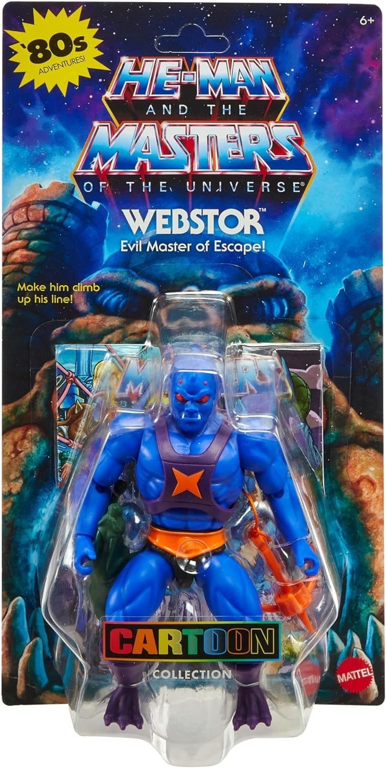 Webstor es la criatura elegida por Skeletor cuando hay que hacerse cargo de colarse en algún sitio o robar alguna pieza clave para su bando. La capacidad de Webstor de escalar paredes y de sigilo, lo convierte en el espía ideal para infiltrarse tras líneas enemigas y escudriñar a los aliados de He-Man desde las alturas o desde las sombras. Esta figura articulada de 14 cms de Webstor incluye una estatua de un felino, su gancho para escalada y un cómic del personaje. Esta creación de Mattel pertenece a la Cartoon Collection y está hecho de PVC. Viene en un colorido blíster retro con los colores del personaje.