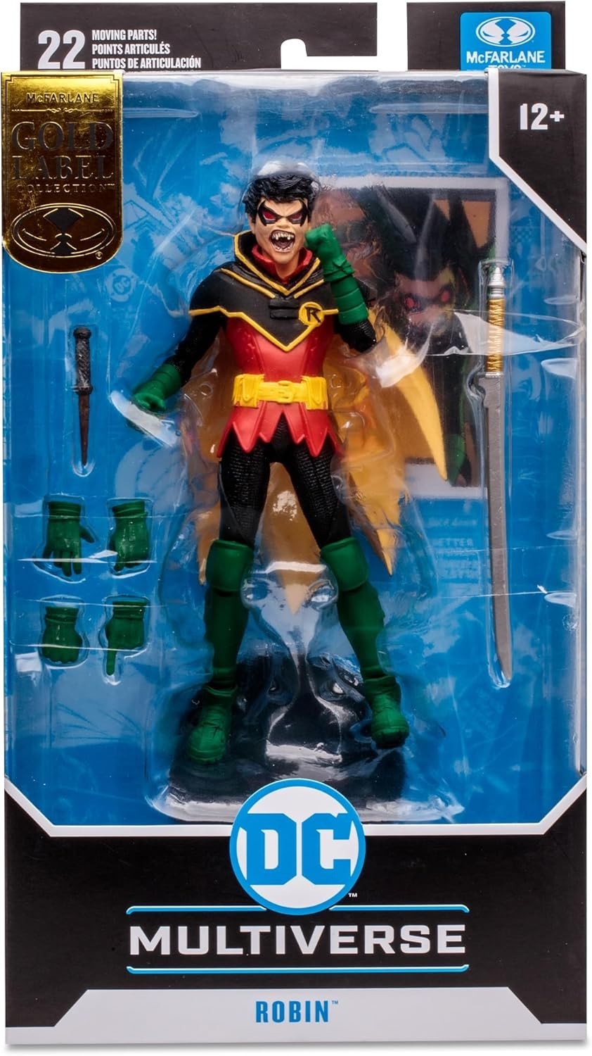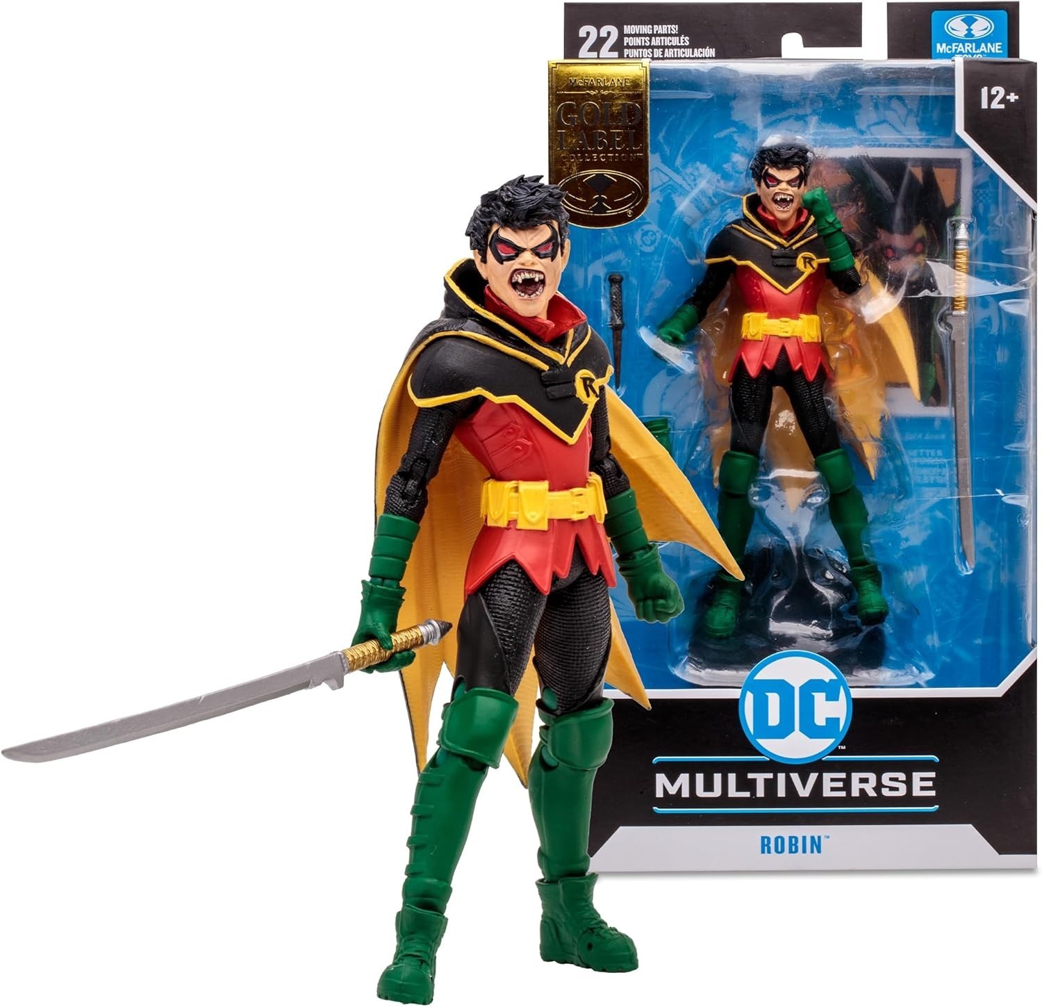 ¡Prepárate para sumergirte en la oscuridad con esta increíble figura de Robin, inspirada en el universo DC Vs Vampires de McFarlane Toys! Con una altura de 17 cms, esta figura articulada captura al intrépido héroe en una versión más oscura y feroz, destacando en la línea Gold Label por su diseño exclusivo y detallado. Su traje, con detalles únicos inspirados en el mundo vampírico, refleja la fusión entre el joven héroe y la amenaza sobrenatural que acecha Gotham. Equipada con una espada afilada y de gran detalle, Robin está listo para enfrentarse a la oscuridad con una postura desafiante. La figura también incluye manos intercambiables, lo que permite personalizarla para recrear una amplia variedad de escenas llenas de acción. Para darle estabilidad y realce a tu exposición, viene con una sólida peana, que te permitirá mostrarla con orgullo en cualquier rincón de tu colección. Además, no puede faltar la tarjeta coleccionable, una pieza perfecta para los verdaderos fanáticos de la saga. Con su diseño excepcional, articulaciones de alta calidad y los accesorios incluidos, esta figura de Robin es el complemento ideal para cualquier amante de los cómics de DC y coleccionistas de figuras. ¡Atrévete a unirte a la lucha contra los vampiros con el joven héroe!