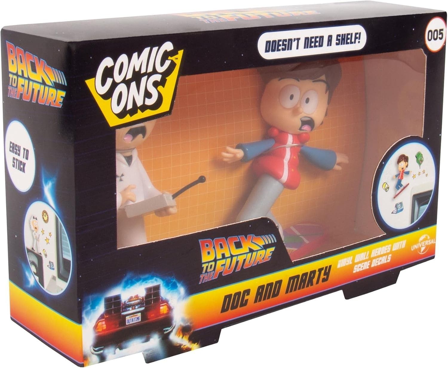 ¿Conoces las figuritas Comic Ons, de Fizz Creations? ¡Pues ya estás tardando! Estas pequeñas maravillas son figuras que puedes adherir a superficies para recrear icónicas escenas de las películas de tu infancia y juventud. Esta ingeniosa manera de rodearte de tus personajes y pelis favoritas, permite echarte un par de carcajadas cada vez que poses la mirada en los simpáticos personajillos y su diseño estilo dibujos animados. Incluye stickers para decorar aún más y añadir detalles a los personajes. Estas figuras recrean a Doc con su mando teledirigido del DeLorean y vistiendo su uniforme de protección contra radiación, y a Marty alucinando y tratando de mantener el equilibrio sobre el aeropatín que se agenció en su escapadita al futuro. ¿Carreteras? A donde vamos no necesitamos carreteras.