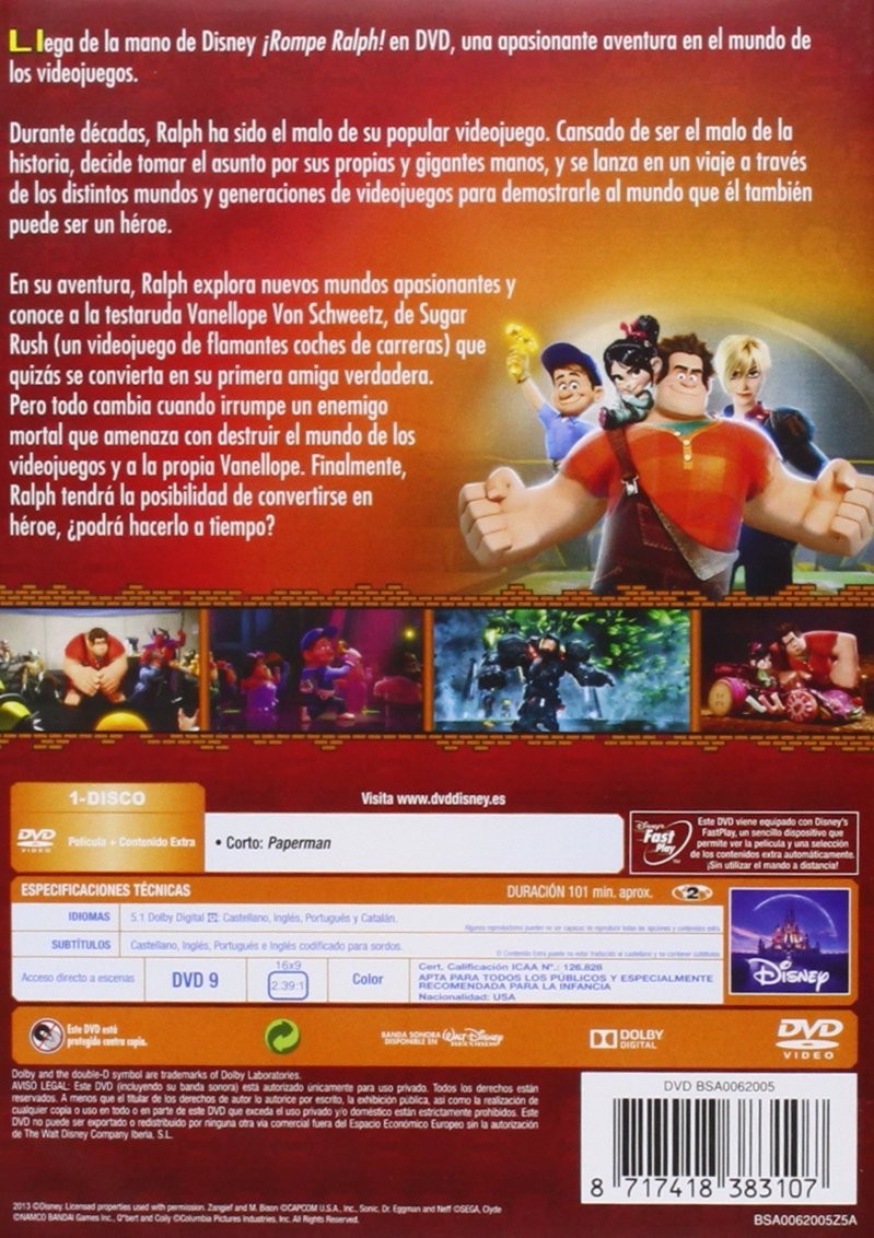Comes from Disney Wreck Rompe Ralph ! on DVD , an exciting adventure in the world of video games. For decades, Ralph has been the bad guy in his popular video game. Tired of being the bad guy of the story, he decides to take matters into his own giant hands, and sets off on a journey through the different worlds and generations of video games to show the world that he can also be a hero. On his adventure, Ralph explores exciting new worlds and meets the headstrong Vanellope Von Schweetz, from Sugar Rush (a video game about brand new racing cars) who may become his first real friend. But everything changes when a deadly enemy breaks in and threatens to destroy the world of video games and Vanellope herself. Finally, Ralph will have the chance to become a hero, can he do it in time?