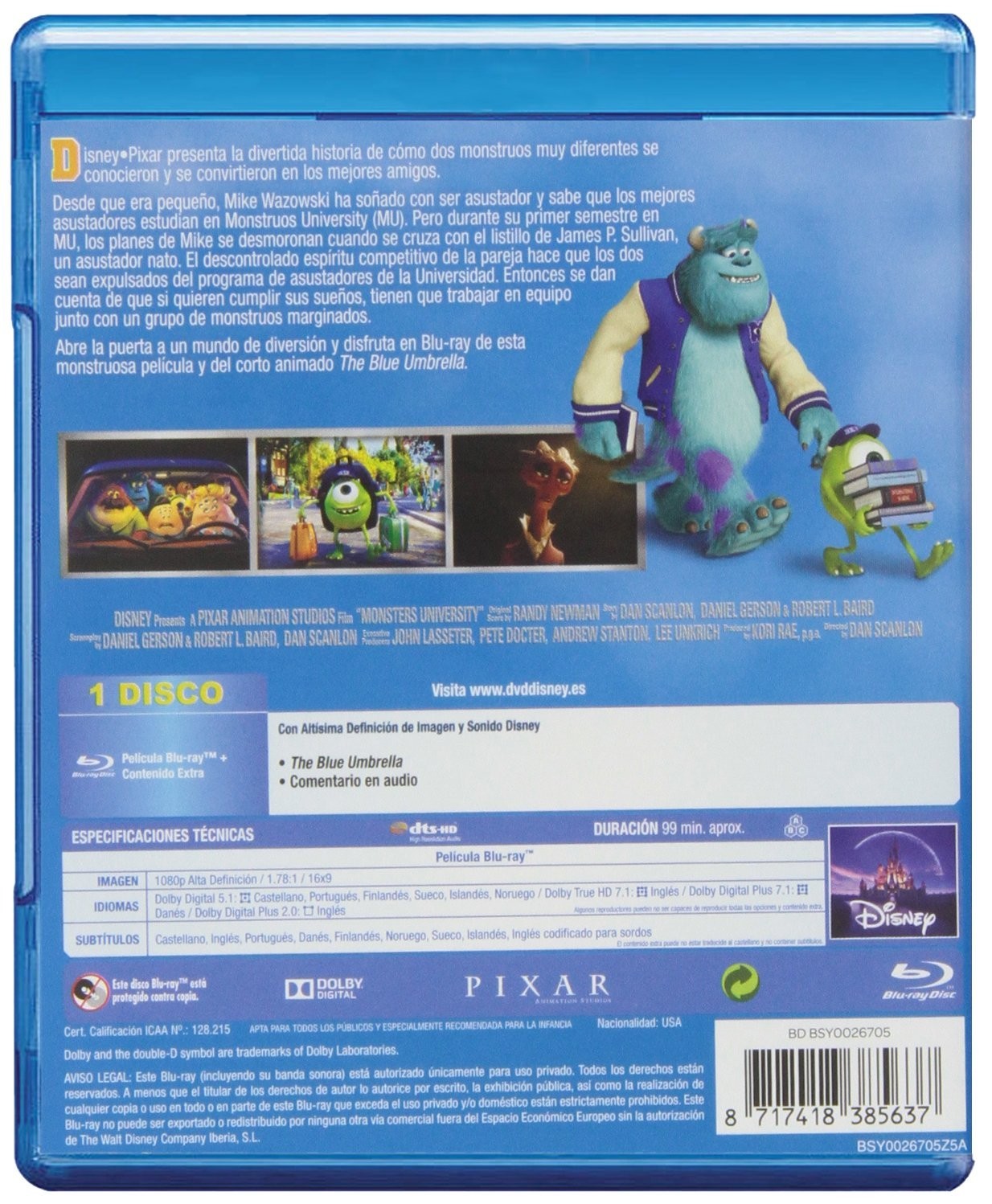 <div id="productDescription" class="a-section a-spacing-small"><br /><p><span>Disney Pixar presents the fun story of how two very different monsters met and became best friends. Since he was little, Mike Wazowski has dreamed of being a scarer and he knows that the best scarers study at Monstruos University (MU). But during his first semester at MU, Mike's plans fall apart when he crosses paths with smart-ass James P. Sullivan, a natural-born scarer. The couple's uncontrolled competitive spirit causes them both to be expelled from the University's scarer program. Then they realize that if they want to fulfill their dreams, they have to work as a team along with a group of outcast monsters. Open the door to a world of fun and enjoy this monster movie and the animated short <span>The</span> Blue Umbrella on Blu-ray.</span></p></div>