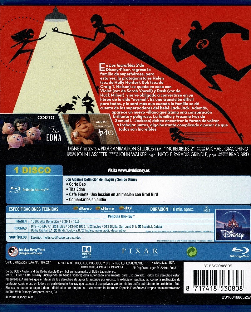 Extrashort bao: (00:07:23) (audio: only has music and effects) (subtitles: does not have).tita edna: (00:05:04) (audio: English) (subtitles: Spanish, English coded for the deaf ). When Bob Parr visits super-suit designer Edna mode, looking for help with his high-energy toddler Jack-Jack, Edna pulls an all-nighter, designing a suit to harness the baby's seemingly limitless powers. strong coffee: a lesson in animation with brad bird: (00:18:01) (audio: english) (subtitles: spanish, english coded for the deaf). Brad Bird's passion for animation dates back to his childhood and mentorship under disney 's Milt Kahl, and that enthusiasm and powerful insight emanates from every film he's made. Take a deep dive into Brad's early years at disney Animation Studios, his time directing at Pixar, and his notoriously larger-than-life personality.comentarios . Audio Commentary: (01:57:50) (Languages: English) (Subtitles: Spanish, English coded for the deaf). Watch the film with audio commentary by:alan barillaro, supervising animatortony fucile, supervising animator, story artist & character designerdave mullins, supervising animatorbret parker, animation second unit & crowds supervisor. . audio7.1dts-hdma:ingl es5.1 dts-hdhr: english2.0 dolby digital: english2.0 dolby digital: english descriptive audio5.1 dts digital surround: spanish5.1 dolby digital: indian5.1 dts digital surround: catalansubtitles spanish , English coded for the deaf