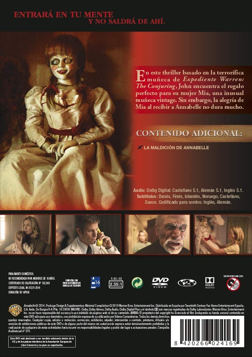 Product Description The Curse of Annabelle /Bloody Tears of Possession/Demon Dolls/A Domoniac Trial/Deleted Scenes Synopsis In this thriller based on the terrifying doll from The Warren File: The Conjuring, John finds the perfect gift for his wife Mia, a unusual vintage doll. However, Mia's joy at welcoming Annabelle does not last long.