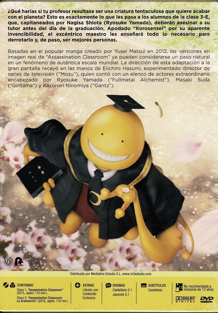 ASSASSINATION CLASSROOM:The Japanese Government gives the students of class 3-E an important mission: they must eliminate their new tutor, a powerful tentacled creature that plans to destroy the planet on graduation day. To help them in their mission, Professor Korosensei himself will teach them everything necessary to put an end to him before the cruel murderers who arrive in the classroom do so.