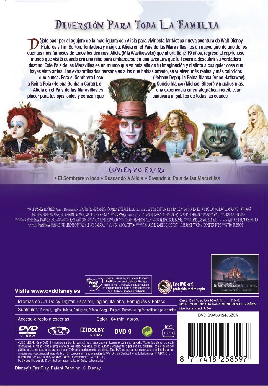 Inspirada en la obra homónima de Lewis Carroll. Alicia (Mia Wasikowska), una joven de 19 años, acude a una mansión victoriana para asistir a una fiesta de la alta sociedad. Cuando está a punto de recibir públicamente una propuesta de matrimonio, sale corriendo tras un conejo blanco y va a parar al País de las Maravillas, un lugar que había visitado diez años antes, aunque ya no lo recuerda. Ese país era un reino pacífico hasta que la Reina Roja (Helena Bonham Carter) derrocó a su hermana, la Reina Blanca (Anne Hathaway), pero las criaturas que viven en él, dispuestas a rebelarse, esperan contar con el apoyo de Alicia, a la que ayudan a recordar su primera visita al fantástico reino.