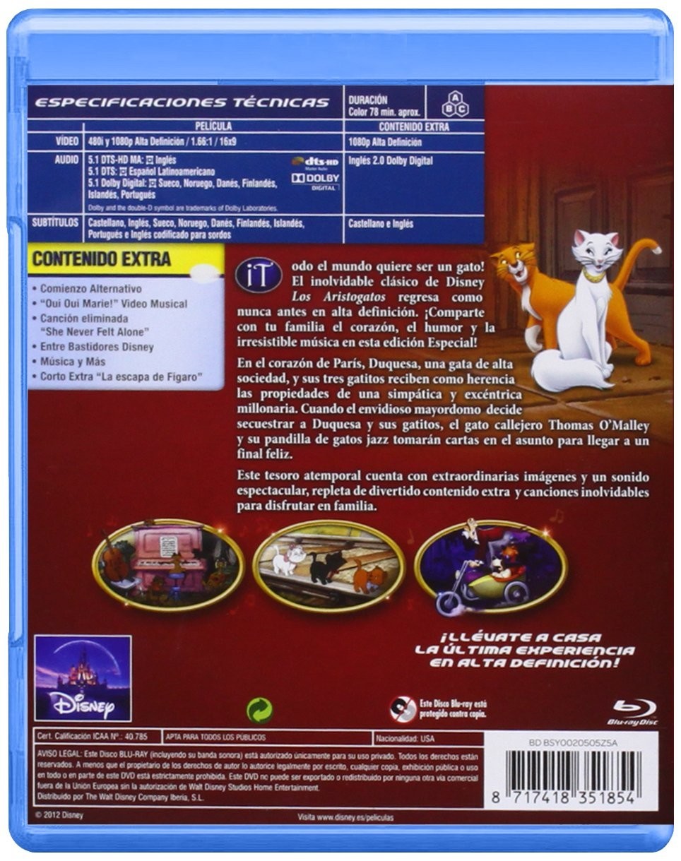 When an eccentric millionaire leaves her entire inheritance to her cats, her greedy butler decides to abandon the felines in the French countryside. This is how this endearing family of cats, made up of Duchess and her three adorable kittens, will embark on a journey full of adventures to return to Paris accompanied at all times by a street casanova named O'Malley. Everyone wants to be a cat! The unforgettable Disney classic Los Aristogatos returns like never before in high definition. Share with your family the heart, the humor and the irresistible music in this special edition! In the heart of Paris, Duchess, a high society cat, and her three kittens receive as an inheritance the properties of a friendly and eccentric millionaire. When the envious butler decides to kidnap Duchess and her kittens, the stray cat Thomas O'Malley and his gang of jazz cats will take matters into their own hands to reach a happy ending.