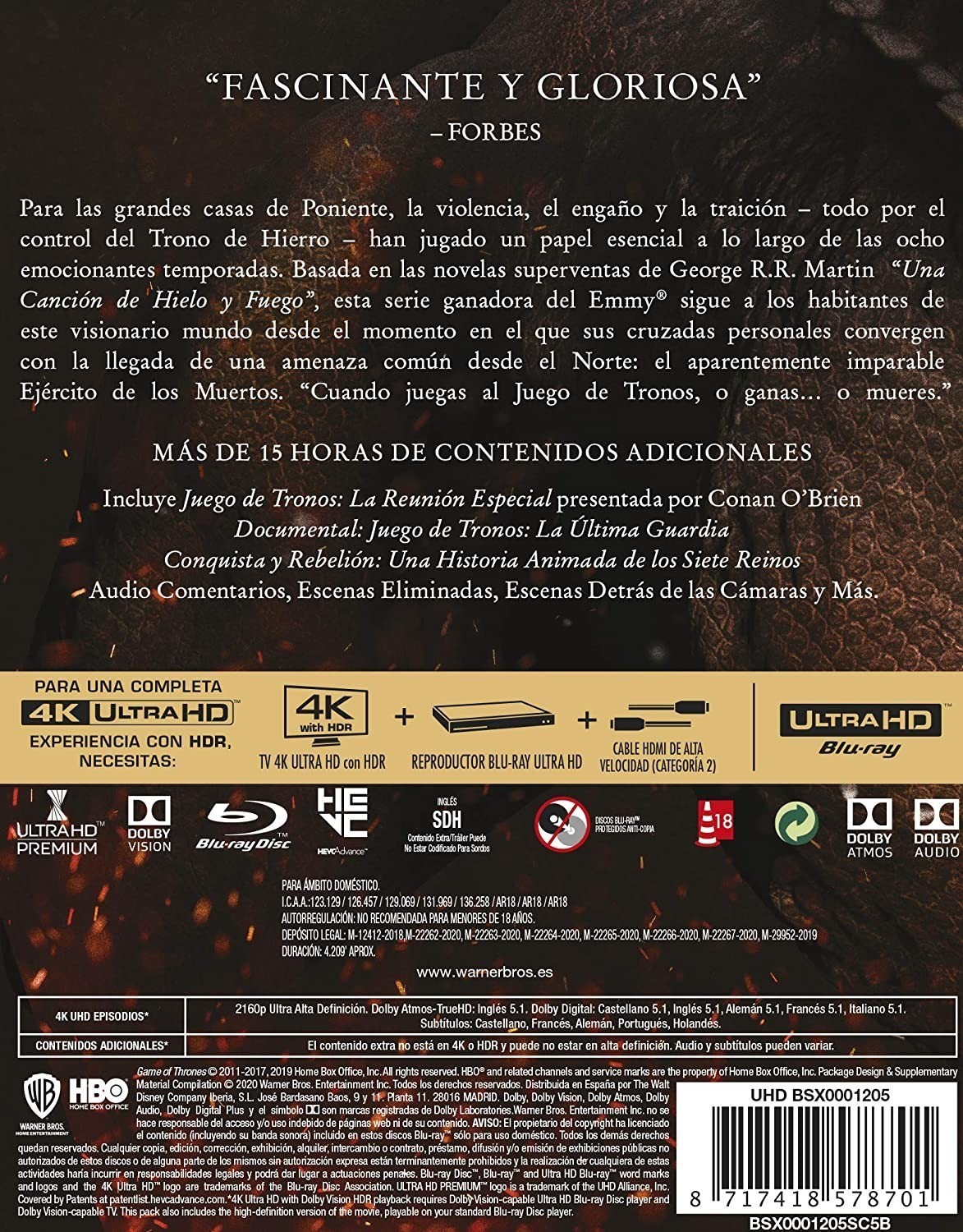 This product includes over 15 hours of bonus content, including Game of Thrones: The Special Reunion presented by Conan O'Brien, the documentary Game of Thrones: The Last Watch, Conquest & Rebellion: An Animated History of the Seven Kingdoms, commentary by audio, deleted scenes, behind-the-scenes footage and more. Synopsis: For the great houses of Westeros, violence, deceit and betrayal have been essential to playing the game of thrones during the exciting eight seasons. Based on George RR Martin 's best-selling book series “A Song of Ice and Fire,” this Emmy®-winning series follows the inhabitants of this visionary world as their personal quests converge with the arrival of an enemy. common: the seemingly unstoppable Army of the Dead. “When you play the game of thrones, you win or you die.”