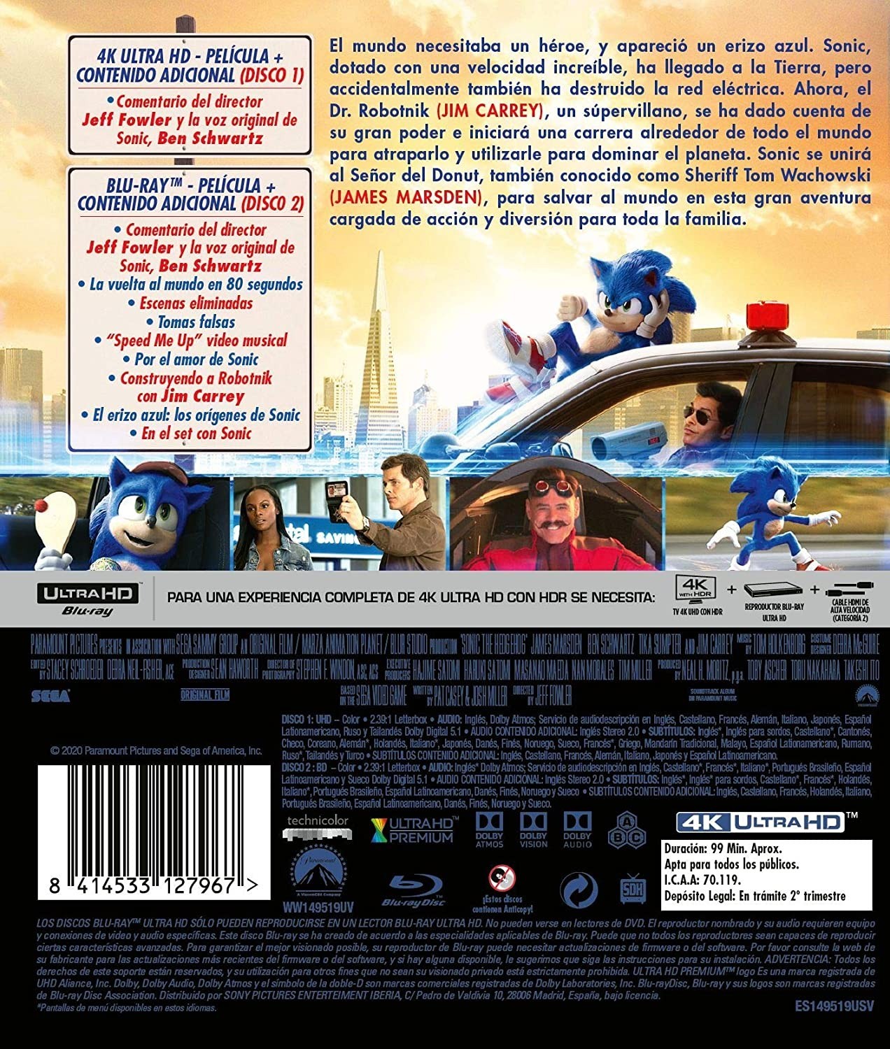 Product Description Around the world in 80 seconds;Deleted scenes;Outtakes;"Speed me up" music video;For the love of Sonic;Building Robotnik with Jim Carrey;On the set with Sonic Synopsis The world needed a hero, and a blue hedgehog appeared. Sonic, gifted with incredible speed, has arrived on Earth, but has also accidentally destroyed the power grid. Now, Dr. Robotnik (JIM CARREY), a supervillain, has realized his great power and will start a race around the world to catch him and use him to dominate the planet. Sonic will join Donut Lord, also known as Sheriff Tom Wachowski (JAMES MARSDEN), to save the world in this great adventure full of action and fun for the whole family.