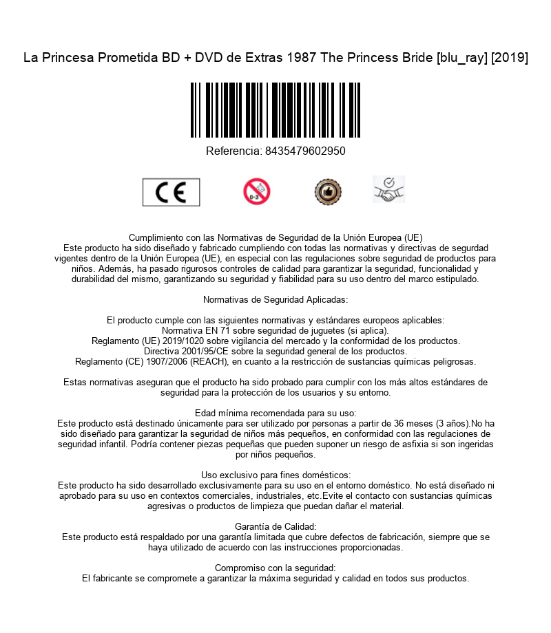 Spain Edition, Blu-Ray/Region A/B/C DVD : LANGUAGES: Spanish (Dolby Digital 2.0), Spanish (Dolby Digital 5.1), French (Dolby Digital 2.0), English (DTS 5.1), Spanish (Subtitles), French (Subtitles), English (Subtitles), Portuguese (Subtitles), WIDESCREEN (1.85:1), EXTRAS: Scene Access, Blu-Ray & DVD Combo, Documentary, Special Edition, Featurette, Interactive Menu, MoldeEquipo Interview(s) , Remastered, System 2- DVD , Trailer(s), SYNOPSIS: After seeking his fortune for five years, Westley (Cary Elwes) returns to his homeland to marry his love, the beautiful Buttercup ( Robin Wright Penn), whom he I had sworn eternal love. SCREENED/AWARDED AT: Oscar Academy Awards, Toronto International Film Festival, ...The Princess Bride / The Princess Bride (Blu-Ray & DVD Combo) (Blu-Ray)