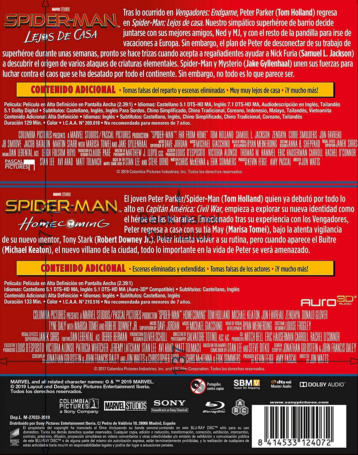 Product Description Outtakes of the cast and deleted scenes;Short Peter's errand list;Spider-man Homecoming: Finding Spider-Man ;Spider-man Homecoming: An inside look at Marvel 's Spider-Man Synopsis Spider-man: Far From Home: After what happened in Avengers: Endgame, Peter Parker (Tom Holland) returns in Spider-Man : Far From Home. Our friendly neighborhood superhero decides to get together with his best friends, Ned and MJ, and the rest of the gang to go on vacation to Europa . However, Peter's plan to take a break from his superhero work for a few weeks is soon shattered when he reluctantly agrees to help Nick Fury (Samuel L. Jackson) uncover the mystery of several elemental creature attacks. Spider-Man and Mysterio (Jake Gyllenhaal) join forces to fight the chaos that has been unleashed across the continent. However, not everything is what it seems to be; Spider-man: Homecoming: The young Peter Parker/ Spider-Man (Tom Holland), who already debuted in style in Capitán América : Civil War, begins to explore his new identity as the spider web hero. Excited after his experience with the Avengers, Peter returns home to his Aunt May (Marisa Tomei), under the watchful eye of his new mentor, Tony Stark (Robert Downey Jr.). Peter tries to get back to his routine, but when the Vulture (Michael Keaton), the new villain in town, appears, everything important in Peter's life will be threatened.