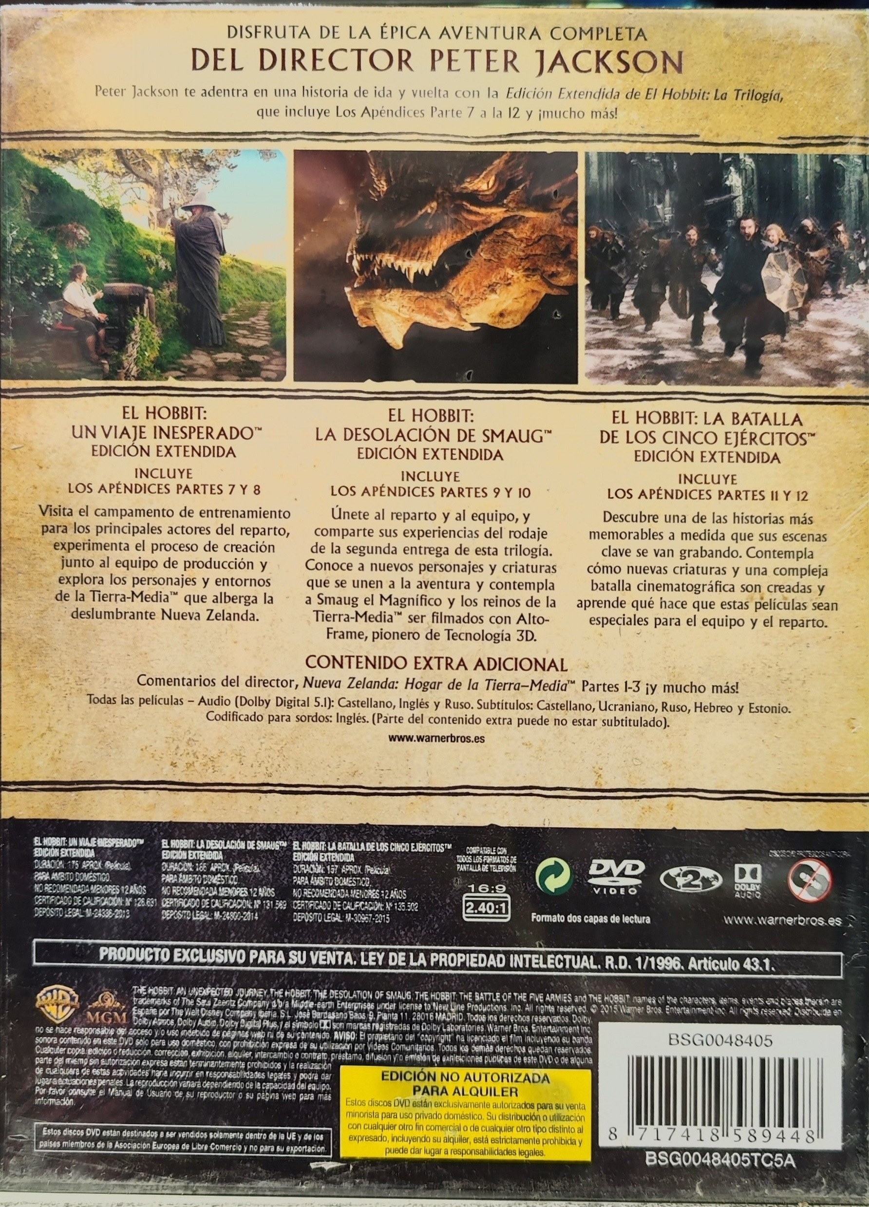 Precuela de la trilogía "El Señor de los Anillos", obra de J.R.R. Tolkien. En compañía del mago Gandalf y de trece enanos, el hobbit Bilbo Bolsón emprende un viaje a través del país de los elfos y los bosques de los trolls, desde las mazmorras de los orcos hasta la Montaña Solitaria, donde el dragón Smaug esconde el tesoro de los Enanos. Finalmente, en las profundidades de la Tierra, encuentra el Anillo Único, hipnótico objeto que será posteriormente causa de tantas sangrientas batallas en la Tierra Media. ,"El Hobbit: La Desolación de Smaug" continua la aventura de Bilbo Bolsón en su viaje con el mago Gandalf y trece enanos liderados por Thorin Escudo de Roble en una búsqueda épica para reclamar el reino enano de Erebor. En su camino toparán con multitud de peligros y harán frente al temible dragón Smaug. ,Después de haber recuperado el reino del Dragón Smaug en la montaña, la Compañía ha desencadenado, sin querer, una potencia maligna. Un Smaug enfurecido vuela hacia la Ciudad del Lago para acabar con cualquier resto de vida. Obsesionado con las enormes riquezas en su poder, el rey enano Thorin se vuelve codicioso, mientras Bilbo intenta hacerle entrar en razón haciendo algo desesperado y peligroso. Pero hay aún mayores peligros por delante. Sin la ayuda del mago Gandalf, su gran enemigo Sauron ha enviado legiones de orcos hacia la Montaña Solitaria en un ataque épico. Cuando la oscuridad se cierna sobre ellos, las razas de los Enanos, Elfos y Hombres deberán decidir si unirse o ser destruidos. Bilbo se encontrará así en la batalla épica de los Cinco Ejércitos, donde el futuro de la Tierra Media está en juego.