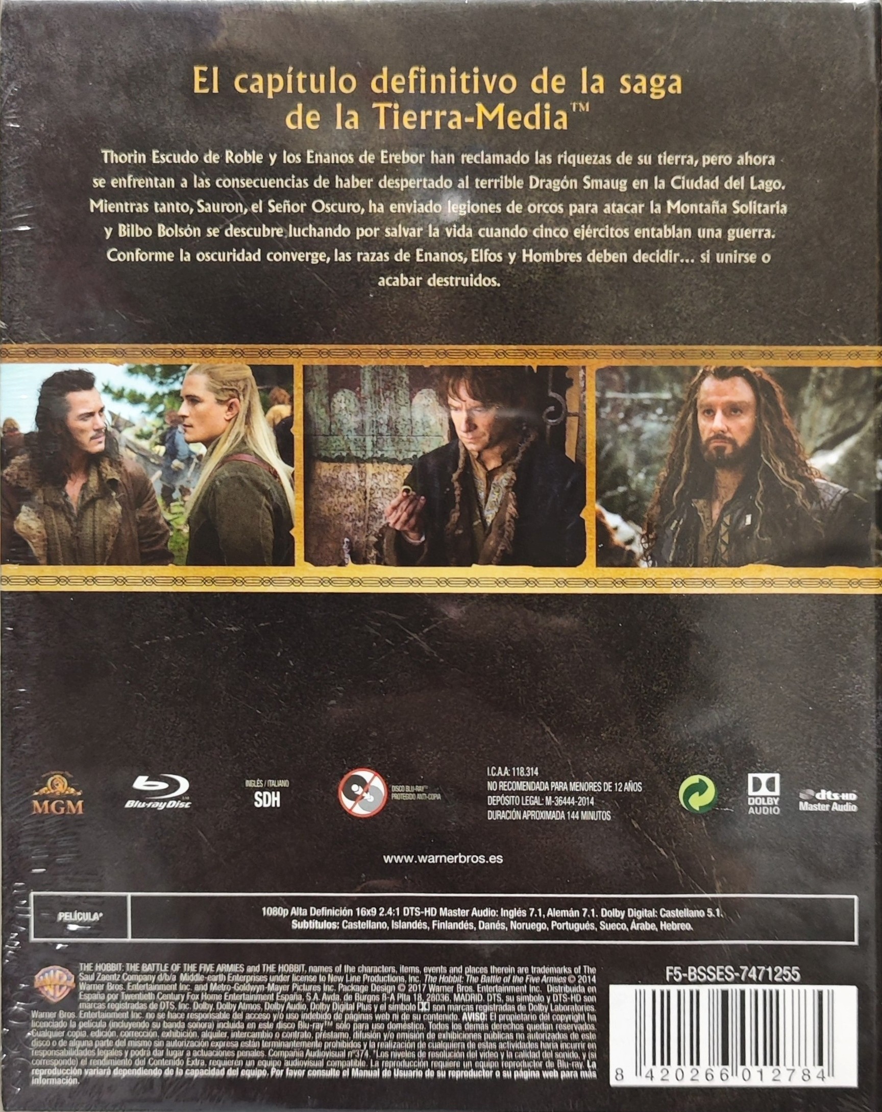 Después de haber recuperado el reino del Dragón Smaug en la montaña, la Compañía ha desencadenado, sin querer, una potencia maligna. Un Smaug enfurecido vuela hacia la Ciudad del Lago para acabar con cualquier resto de vida. Obsesionado con las enormes riquezas en su poder, el rey enano Thorin se vuelve codicioso, mientras Bilbo intenta hacerle entrar en razón haciendo algo desesperado y peligroso. Pero hay aún mayores peligros por delante. Sin la ayuda del mago Gandalf, su gran enemigo Sauron ha enviado legiones de orcos hacia la Montaña Solitaria en un ataque épico. Cuando la oscuridad se cierna sobre ellos, las razas de los Enanos, Elfos y Hombres deberán decidir si unirse o ser destruidos. Bilbo se encontrará así en la batalla épica de los Cinco Ejércitos, donde el futuro de la Tierra Media está en juego.