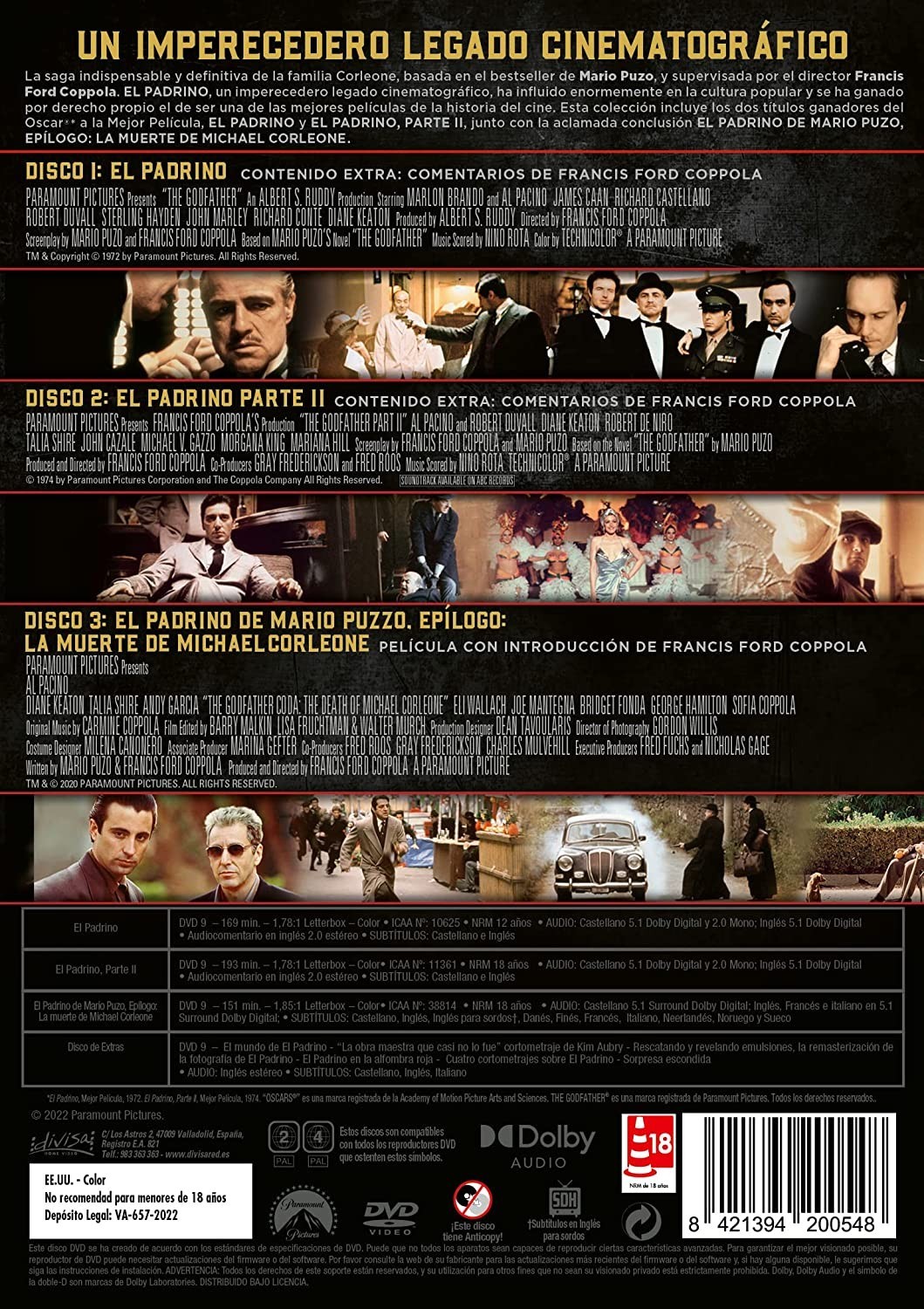 AN EVERELISHING CINEMATIC LEGACY 4-DIC SET. The indispensable and definitive saga of the Corleone family, based on the bestseller by Mario Puzo, and supervised by director Francis Ford Coppola. A lasting cinematic legacy, THE GODFATHER has greatly influenced popular culture and has earned its title as one of the best films in the history of cinema. This collection includes the two Oscar® * winning titles for Best Picture, THE GODFATHER and THE GODFATHER, PART II, along with the acclaimed conclusion THE GODFATHER BY MARIO PUZO, EPILOGUE: LA DEATH OF MICHAEL CORLEONE.