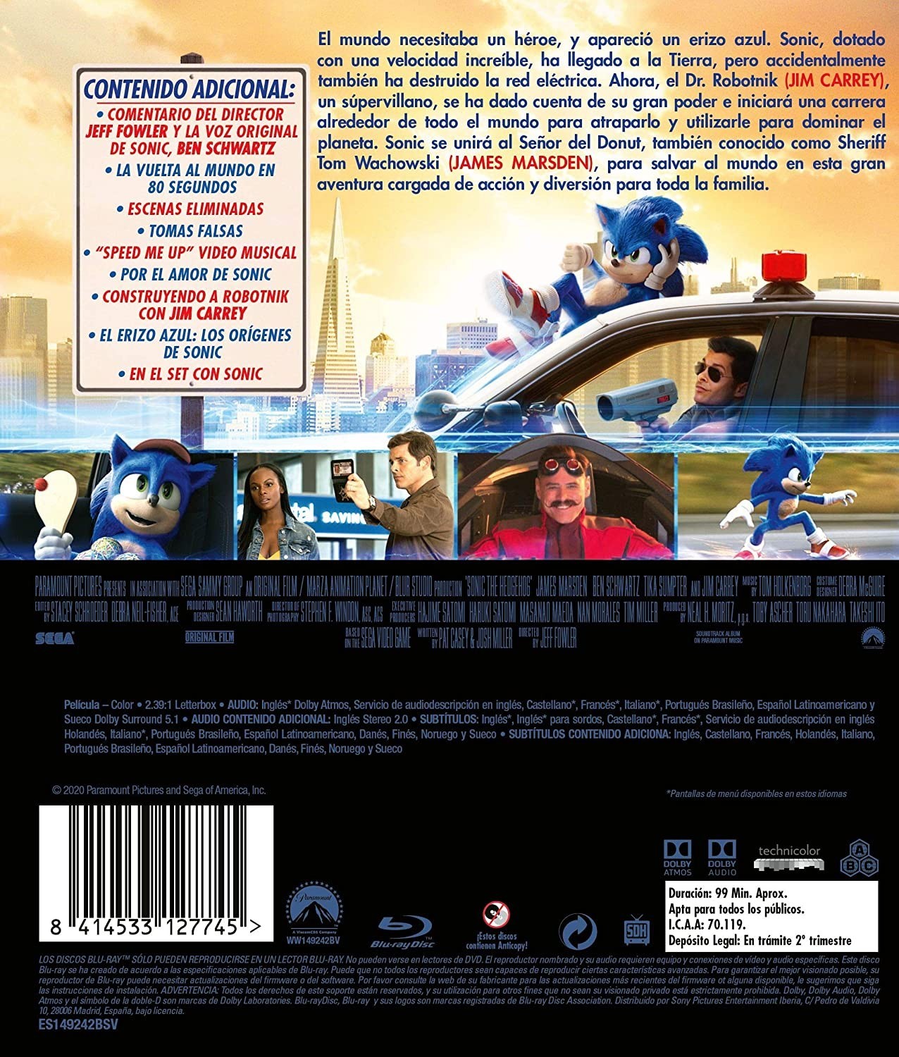 Commentary with director Jeff Fowler and the original voice of Sonic, Ben Schwartz;Around the world in 80 seconds;Deleted scenes;Outtakes;"Speed me up" music video;For the love of Sonic;Building Robotnik with Jim Carrey ;On the set with Sonic;The Blue Hedgehog: Sonic's Origins