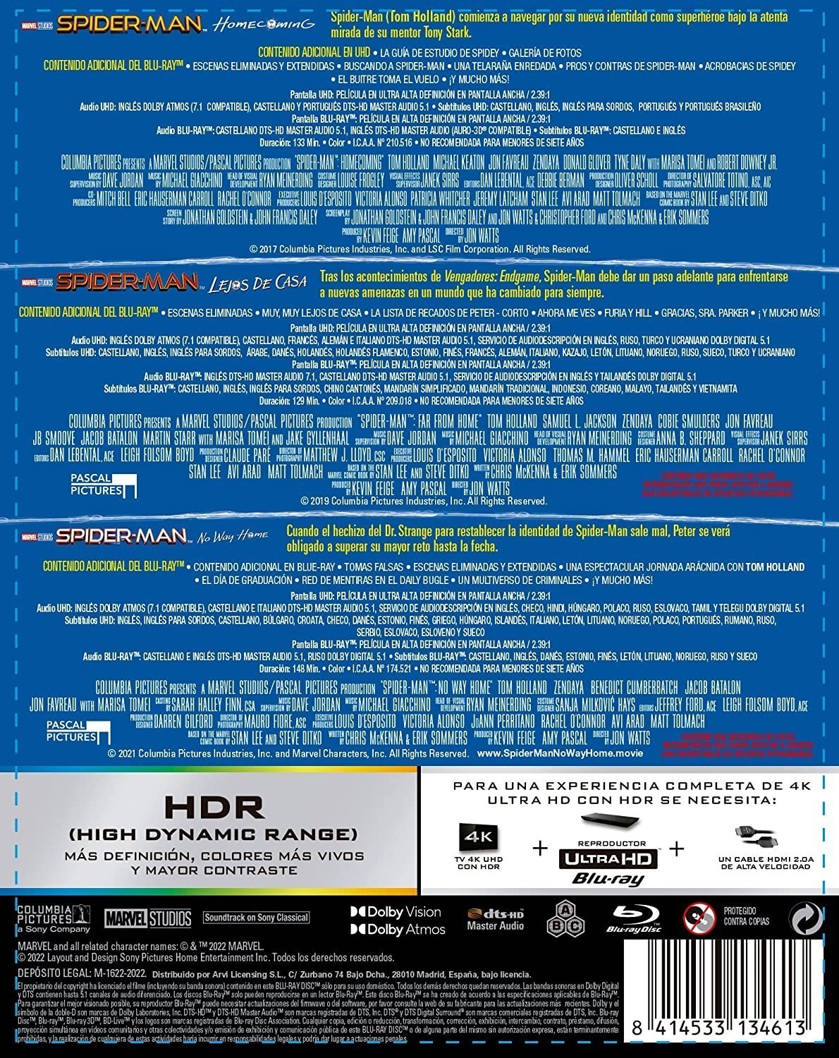 Product description Pack that includes the last three installments of the Spider-Man franchise, produced by Marvel Studios and starring Tom Holland. Synopsis Pack that includes the last three installments of the...