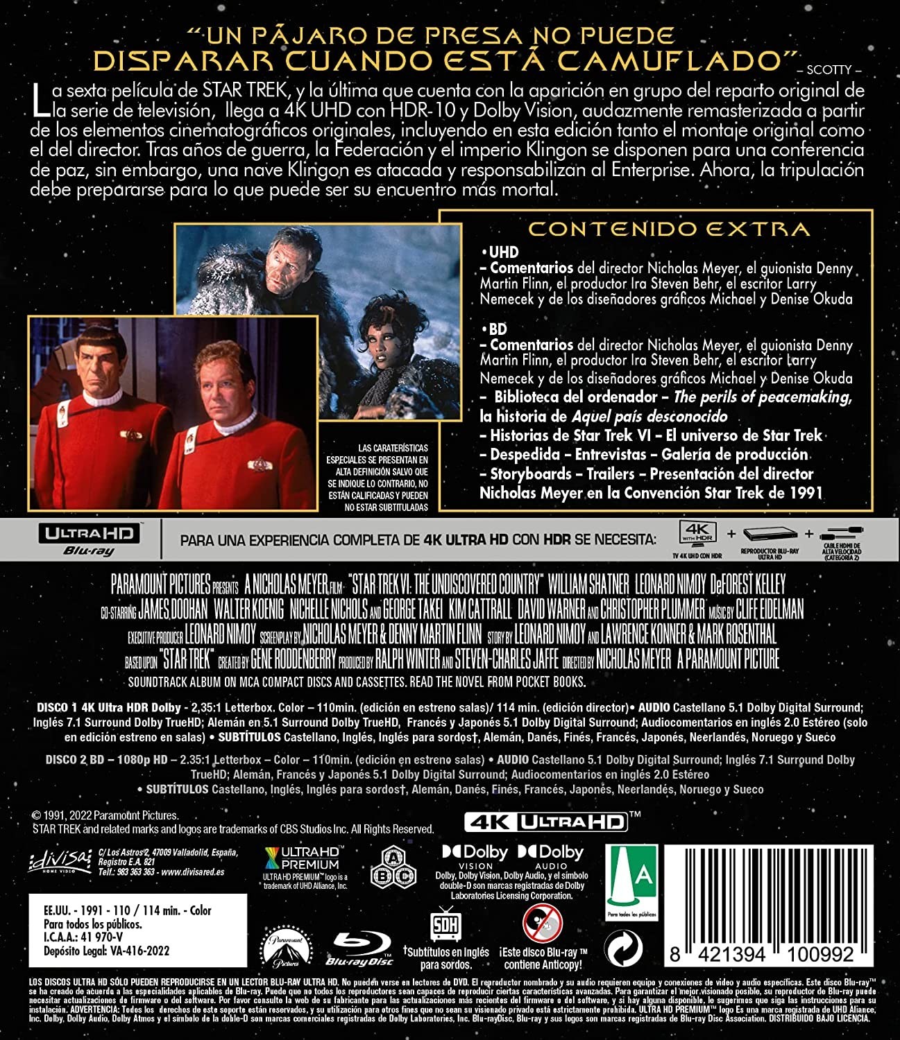 Can't a Bird of Prey Shoot When It's Camouflaged? (Scotty) The Sixth Film in the Original Film Saga Looks Better Than Ever on Blu-Ray?, Boldly Remastered from a 4K Scan of the Original Film Elements. After years of war, the Federation and the Klingon Empire prepare for a peace conference, however, a Klingon ship is attacked and the Enterprise is blamed. Now, the crew must prepare for what may be their deadliest encounter. Extras (Special Features are presented in High Definition unless otherwise noted, are not graded and may not be subtitled): ?Uhd: Commentary From Director Nicholas Meyer, Screenwriter Denny Martin Flinn, Producer Ira Steven Behr, Writer Larry Nemecek And Graphic Designers Michael And Denise Okuda ?Bd: Comments From Director Nicholas Meyer, Screenwriter Denny Martin Flinn, Producer Ira Steven Behr, Writer Larry Nemecek And Graphic Designers Michael And Denise Okuda ? Computer Library The Perils Of Peacemaking, The History Of That Desconocido Country? Star Trek Stories I Saw? The Star Trek Universe? Farewell ? Interviews? Production Gallery ? Storyboards? Trailers? Presentation By Director Nicholas Meyer At The 1991 Star Trek Convention. Disc 1 4K Ultra Hdr Dolby - 2.35:1 Letterbox. Color ? 110Min. (Premiere Edition)/ 114 Min. (Director's Edition)? Audio Spanish 5.1 Dolby Digital Surround, English 7.1 Surround Dolby Truehd, German in 5.1 Surround Dolby Truehd, French and Japanese 5.1 Dolby Digital Surround, Audio Commentaries in English 2.0 Stereo (Only In Theatrical Release Edition) ? Subtitles Spanish, English, English for the Deaf?, German, Danish, Finnish, French, Japanese, Dutch, Norwegian and Swedish. Disc 2 Bd? 1080P HD? 2.35:1 Letterbox ? Color ? 110Min. (Premiere Edition) ? Audio Spanish 5.1 Dolby Digital Surround, English 7.1 Surround Dolby Truehd, German, French and Japanese 5.1 Dolby Digital Surround, Audio Commentaries In English 2.0 Stereo ? Subtitles Spanish, English, English for the Deaf?, German, Danish, Finnish, French, Japanese, Dutch, Norwegian and Swedish.