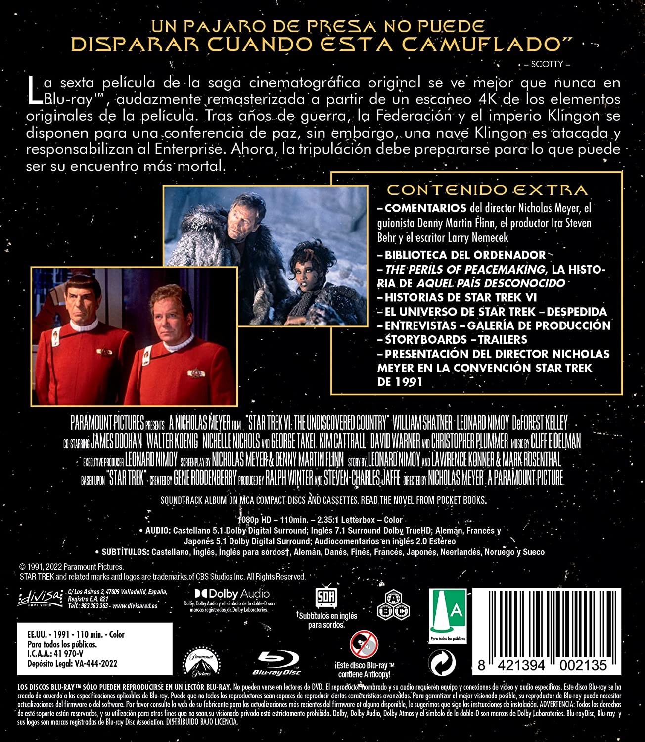 Can't a Bird of Prey Shoot When It's Camouflaged? (Scotty) The Sixth Film in the Original Film Saga Looks Better Than Ever on Blu-Ray?, Boldly Remastered from a 4K Scan of the Original Film Elements. After years of war, the Federation and the Klingon Empire prepare for a peace conference, however, a Klingon ship is attacked and the Enterprise is blamed. Now, the crew must prepare for what may be their deadliest encounter. Extras (Special Features are presented in High Definition unless otherwise noted, are not rated, and may not be subtitled): Commentary From Director Nicholas Meyer, Screenwriter Denny Martin Flinn, Producer Ira Steven Behr, and Writer Larry Nemecek ? Computer Library The Perils Of Peacemaking, The History Of That Desconocido Country? Star Trek Stories I Saw? The Star Trek Universe? Farewell ? Interviews? Production Gallery ? Storyboards? Trailers? Director Nicholas Meyer's Presentation at the 1991 Star Trek Convention. 1080P HD ? 110Min. ? 2.35:1 Letterbox ? Color ? Audio: Spanish 5.1 Dolby Digital Surround, English 7.1 Surround Dolby Truehd, German, French and Japanese 5.1 Dolby Digital Surround, Audio Commentaries In English 2.0 Stereo ? Subtitles: Spanish, English, English for the Deaf?, German, Danish, Finnish, French, Japanese, Dutch, Norwegian and Swedish