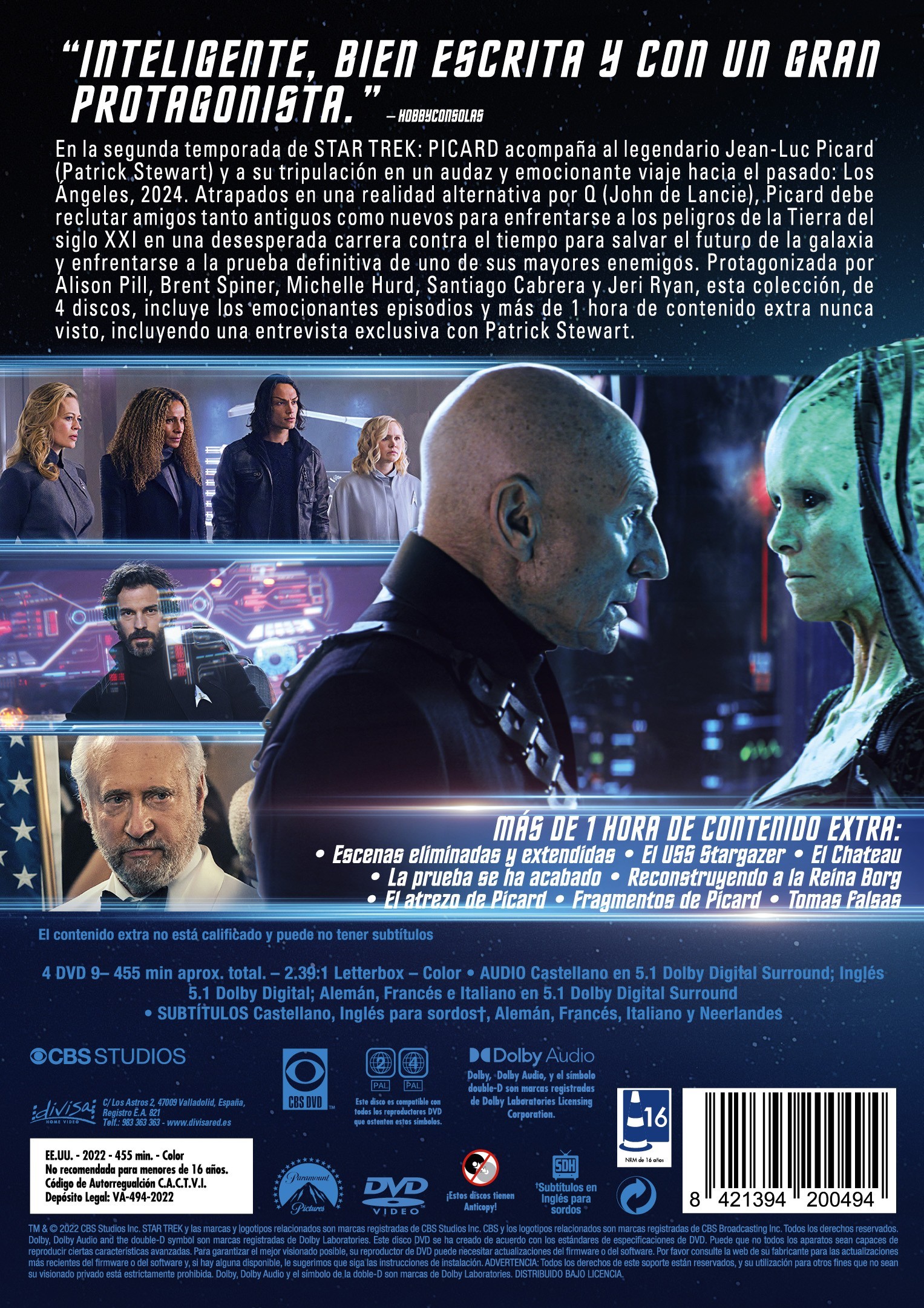 In the second season of Star Trek: Picard accompanies the legendary Jean-Luc Picard (Patrick Stewart) and his crew on a daring and exciting journey into the past: Los Angeles, 2024. Trapped in an alternate reality by Q (John de Lancie) , Picard must recruit friends both old and new to confront the dangers of 21st century Earth in a desperate race against time to save the future of the galaxy and face the ultimate test of one of his greatest enemies. Starring Alison Pill, Brent Spiner, Michelle Hurd, Santiago Cabrera and Jeri Ryan, this 4-disc collection includes the exciting episodes and over 1 hour of never-before-seen bonus content, including an exclusive interview with Patrick Stewart. Extras: Over 1 hour of bonus content: • Deleted and extended scenes • The USS Stargazer • The Chateau • The test is over • Reconstructing the Borg Queen • Picard's Props • Picard Fragments • Outtakes Running time: 455 minutes Image: 2.39:1 Letterbox Audio: Spanish in 5.1 Dolby Digital Surround; English 5.1 Dolby Digital; German, French and Italian in 5.1 Dolby Digital Surround Subtitles: Spanish, English for the Deaf†, German, French, Italian and Dutch